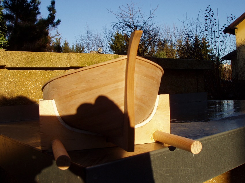 Mój KiM miał półtora miesiąca urlopu a to za sprawą planu budowy dwóch kadłubów w okresie jesienno-zimowym. Ten drugi na pierwszym zdjęciu. Ale urlop się skończył i coś drgnęło. Zrobiłem odciągi wantowe, pachołki i wykończenie burt. W kadłubie zostały jeszcze do zrobienia kotbelki i ławy pod nagle a potem już tylko "mebelki na pokładzie". Stan aktualny na zdjęciach.