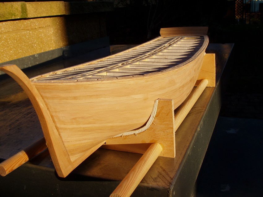 Post ze specjalną dedykacją dla kol Ostrego. Zrobiłem kołkowanie wykałaczkami brzozowymi i wkleiłem falszburty. O kołkowaniu nie ma co pisać bo temat oklepany. Wklejenia nadburci uformowanych na pierwotnym szkielecie sam się też trochę obawiałem ale okazało się że nie taki diabeł straszny.... Najpierw przygotowałem wsporniki o profilu dopasowanym do falszburt w miejscach gdzie będą wklejone. Same nadburcie przymocowałem "na sucho" do burt tak jak powinno ono leżeć w efekcie końcowym. Pozwoliło to określić kąty pod jakim względem pokładu powinny być wklejone wsporniki. Następnie już na klej wstawiłem co drugi wspornik na dziobie i rufie oraz co trzeci na śródokręciu. Powstał jakby nowy szkielet do którego łatwo już wkleić falszburty i resztę wsporników. Wszystko zachowało pierwotny wymagany kształt. Metoda ta ma ten plus że pozwala łatwo oczyścić i szlifować nadburcia nie tylko po zewnętrznej stronie ale również od wewnątrz. A teraz kilka fotek.