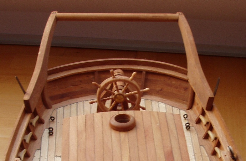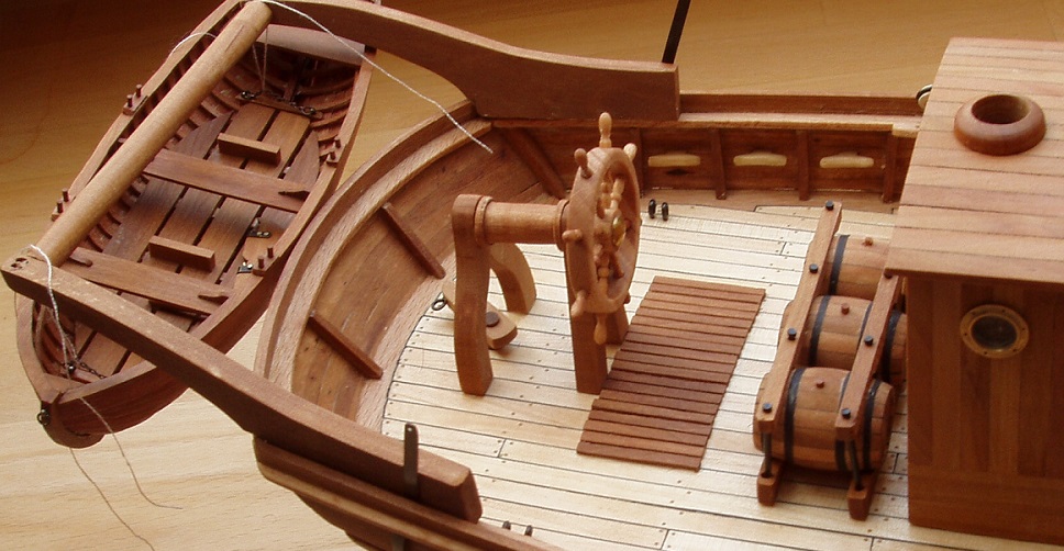 Komplet elementów wyposażenia pokładu zamontowałem na klej, na kołki, oczka na wkręty a następnie odkurzyłem, odpyliłem i całość pokryłem olejem. Rezultat dych robót na załączonych zdjęciach. Teraz przyszedł czas na drzewce. Do toczenia przedłużyłem kombajn radziecki i teoretycznie mogę toczyć maszty do 55 cm długości. Piszę teoretycznie bo przy tej długości nie jest już możliwe użycie noża czy dłuta a raczej ścieranie pilnikiem czy papierem ściernym. Obrabiany maszt wchodzi w wibracje i może wypaść z uchwytów. Opisywał to zresztą Piotr(Dali). Do 30 cm długości nie ma tych problemów. Kończy się pewien etap budowy oznaczający koniec pyłu w modelarni. Pozdrawiam Janek