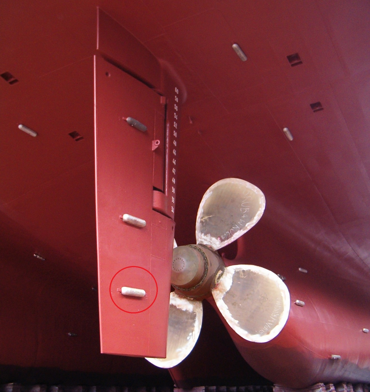 Troszkę wyjaśnienia i parę obrazków z " Ship Knowledge a modern encyclopedia" . Anody na kadłubie są ochroną bierną , wielkości i kształty anod są różne , od 2,5 kg do 25 kg i więcej . Są one stosowane nie tylko na zewnętrznym poszyciu statku , ale i wewnątrz zbiorników balastowych , sea chest - czyli skrzyniach kingstonowych, wewnątrz zaworów itp. czyli tam gdzie jest ruch wody.
