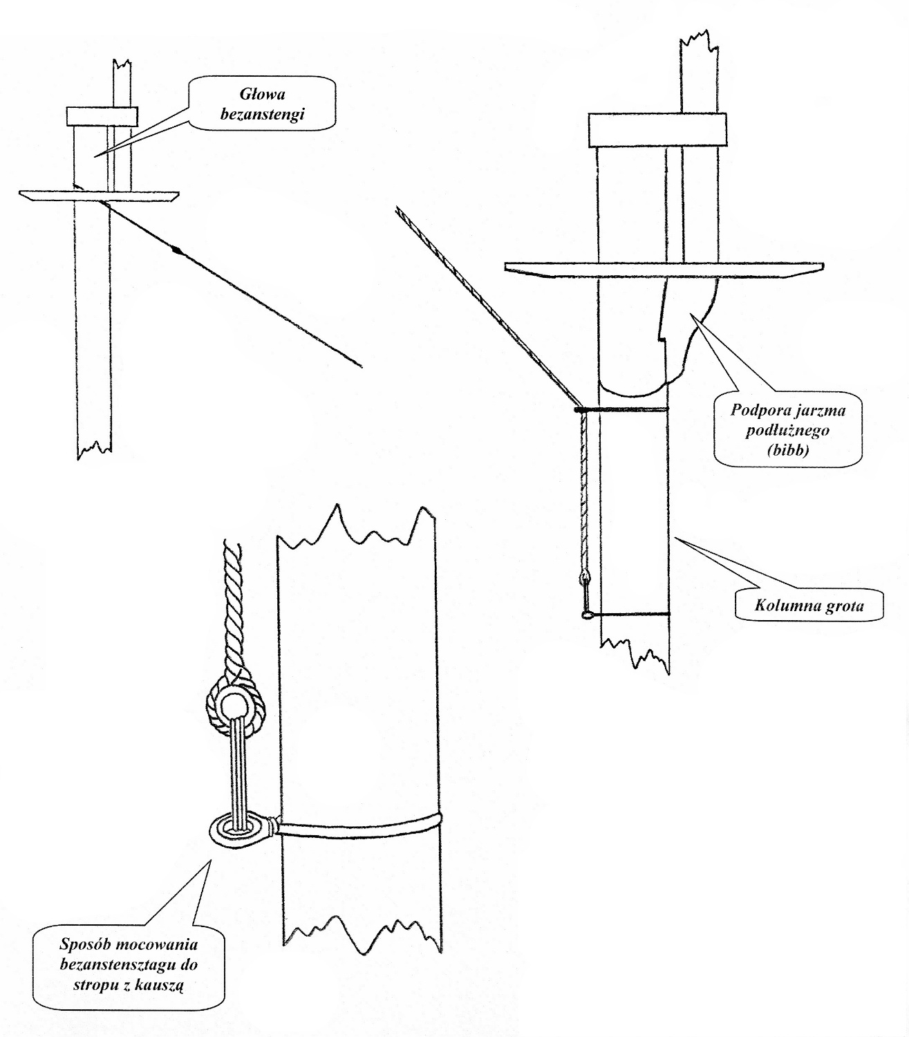 3) Na końcu bezanstensztagu znajduje się oko z kauszą, które za pomocą przewiązu jest mocowane do oka z kauszą zamocowanego stropem do kolumny grota tuż poniżej poziomu katarpin.