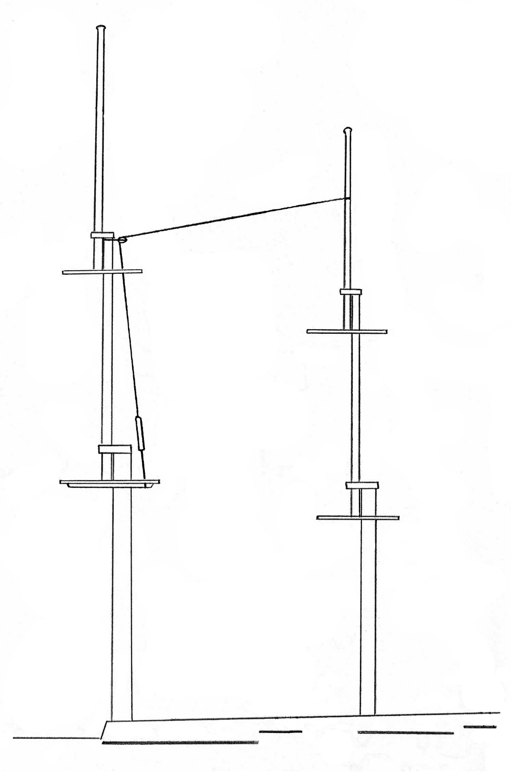 3) Dolne oko bezanbramsztagu mocowane jest następnie – za pomocą przewiązu - do drugiego oka, utworzonego z liny zamocowanej do podłużnych wsporników znajdujących się pod platformą marsa grotmasztu. Lina przytwierdzona jest do wsporników tworząc kształt odwróconej litery „V” (identycznie jak dla grotbramsztagu).