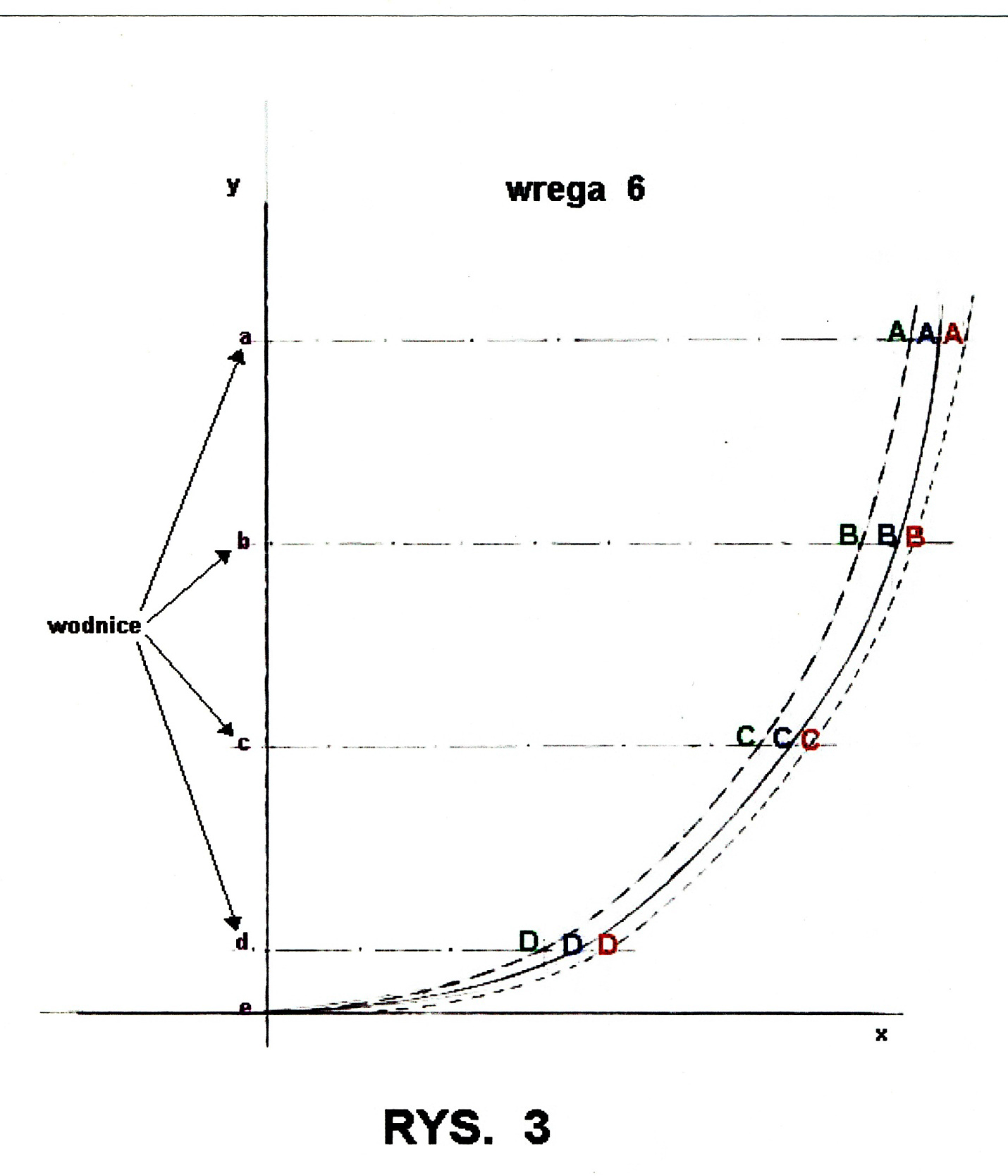 przednia płaszczyznę wręgi 6 , czyli dystans EA na rys. 1, krzywizna oznaczona linia ciągła reprezentuje odstęp EA na rys.1 (jest to środkowa płaszczyzna miedzy polaczeniem obu części owej ‘kanapki’) a krzywizna oznaczona linia - - - - dystans EA z rys. 1, czyli tylna płaszczyznę tejże wręgi. Wszystkie punkty odnoszą się do wodnicy a. Podobnie jest dla pozostałych wodnic.