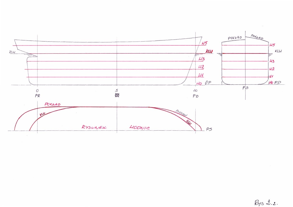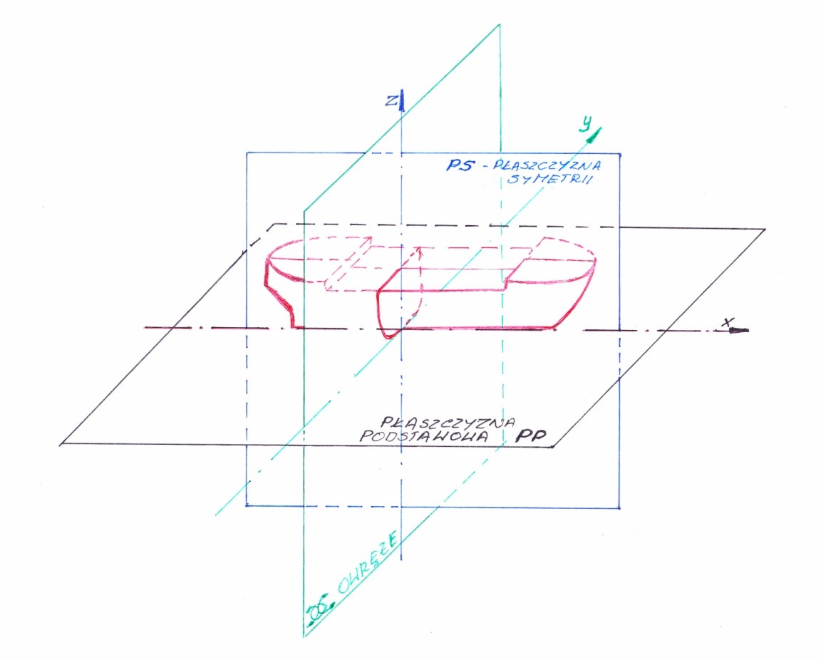 Zgodnie z tym co do tej pory poznaliśmy, kształt kadłuba okrętu przedstawimy zatem jako przekroje rzutowane na trzy płaszczyzny główne, czyli :