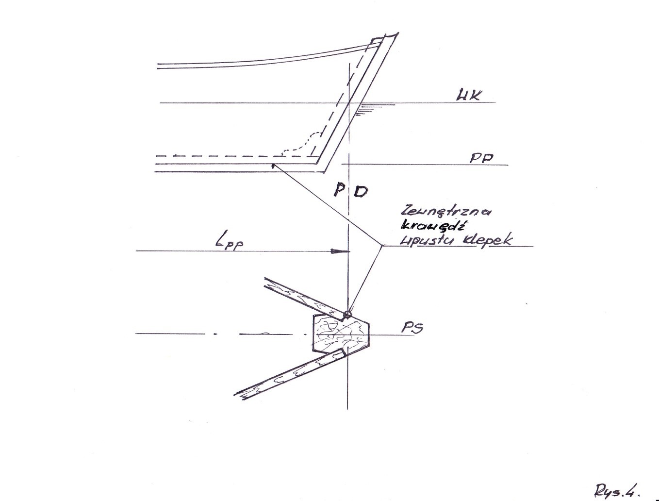 - w statkach drewnianych przez punkt przejścia zewnętrznej krawędzi klepek poszycia do tylnicy na wysokości wodnicy konstrukcyjnej WK ( rys.5 d)