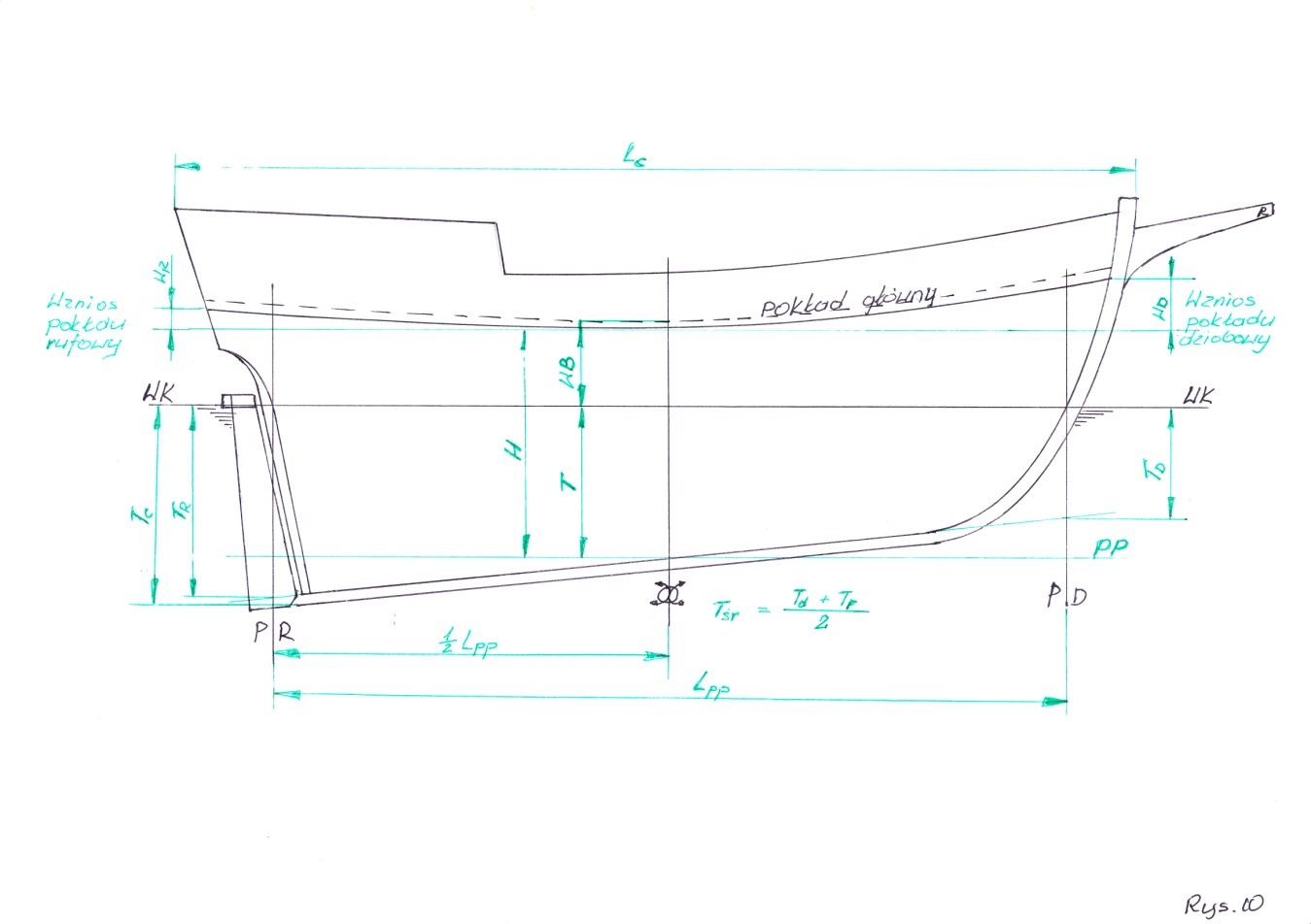 Tr - zanurzenie konstrukcyjne rufy, mierzone na pionie rufowym PR od linii stępki do WK.
