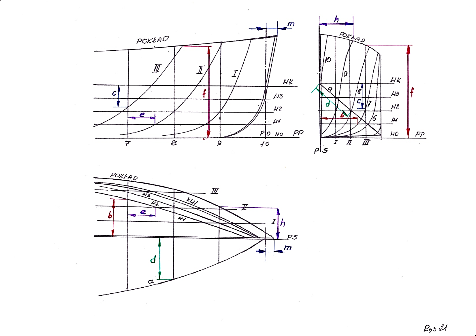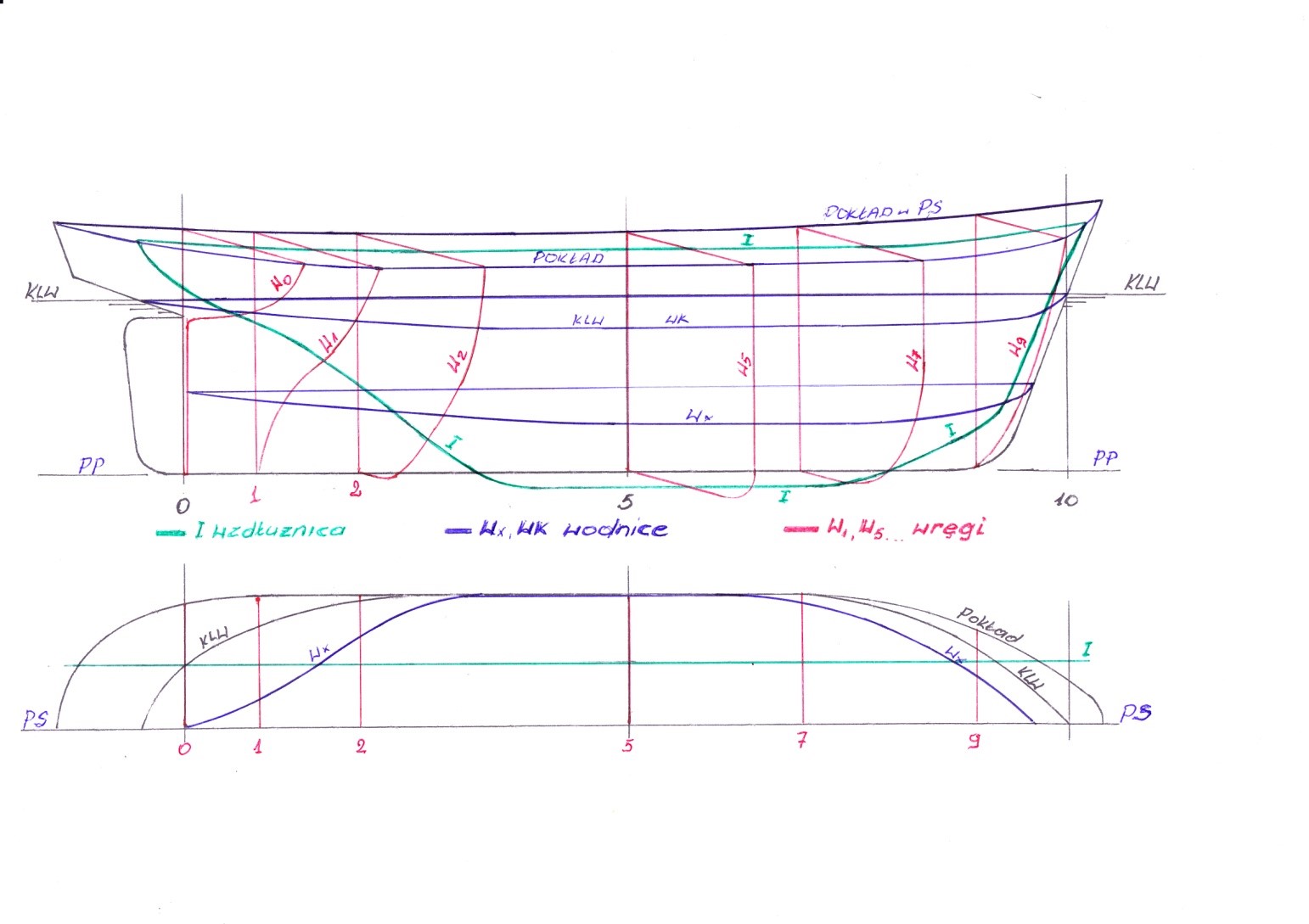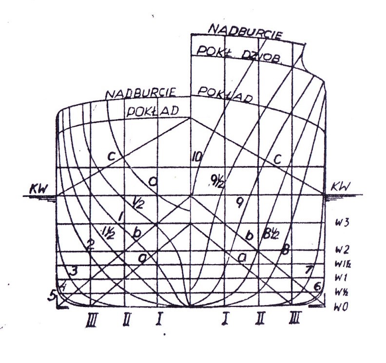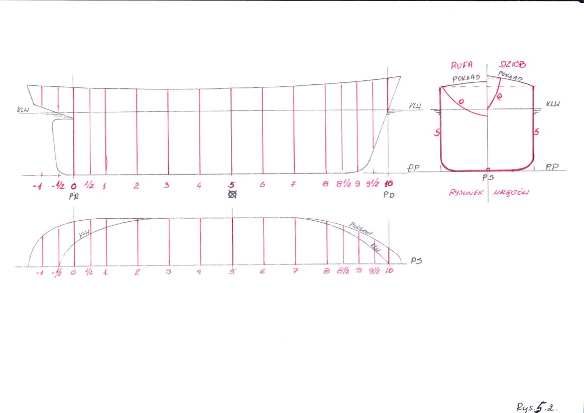 Wszystkie linie krzywe na rysunku teoretycznym ze względu na symetryczność kadłuba rysujemy dla połowy statku. Jedyny wyjątek stanowi wręg 5 ( przy podziale LPP na 10 wręgów teoretycznych ) lub 10 ( przy podziale LPP na 20 wręgów teoretycznych ) na rzucie poprzecznym, owrężenia który rysujemy w całości . Pozostałe wręgi rysujemy po połowie zachowując zasadę , że wręgi od strony rufy czyli od 0 do 5 lub 10 rysujemy po lewej stronie rzutu poprzecznego, natomiast wręgi od owrężenia do dziobu czyli od 5lub 10 do 10 lub 20 ( w zależności od przyjętego podziału) rysujemy po prawej stronie rzutu poprzecznego. Krzywe na poszczególnych rzutach opisujemy odpowiednimi dla nich oznaczeniami . Zasadę numerowania podałem we wcześniejszych rozdziałach. Krzywe muszą mieć przebieg płynny i muszą być wzajemnie uzgodnione. W tym celu sprawdzamy współrzędne punktów przecięcia się krzywych na poszczególnych rzutach rysunku teoretycznego linii kadłuba. Dokładność wykonania siatki i linii powinna sięgać 0,1 mm .