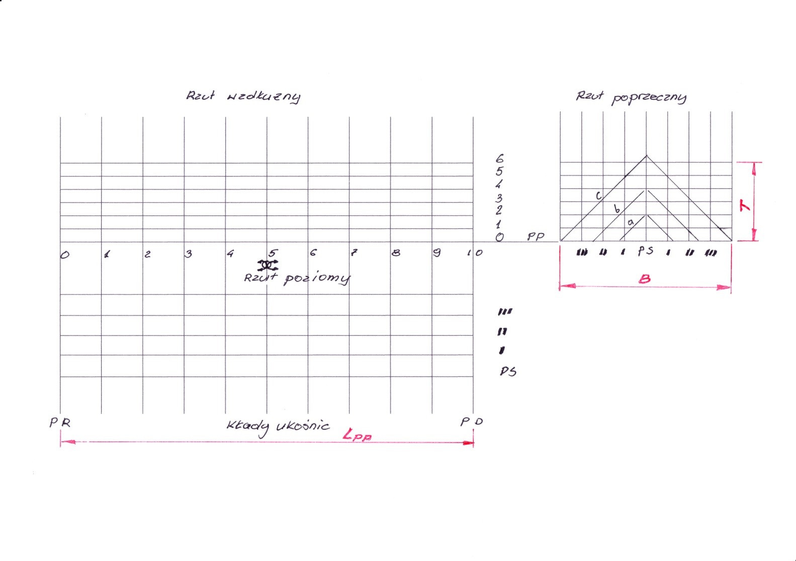 1. Wyznaczamy najniższy punkt wzniosu w połowie długości statku między pionami PD i PR czyli w odległości L/2