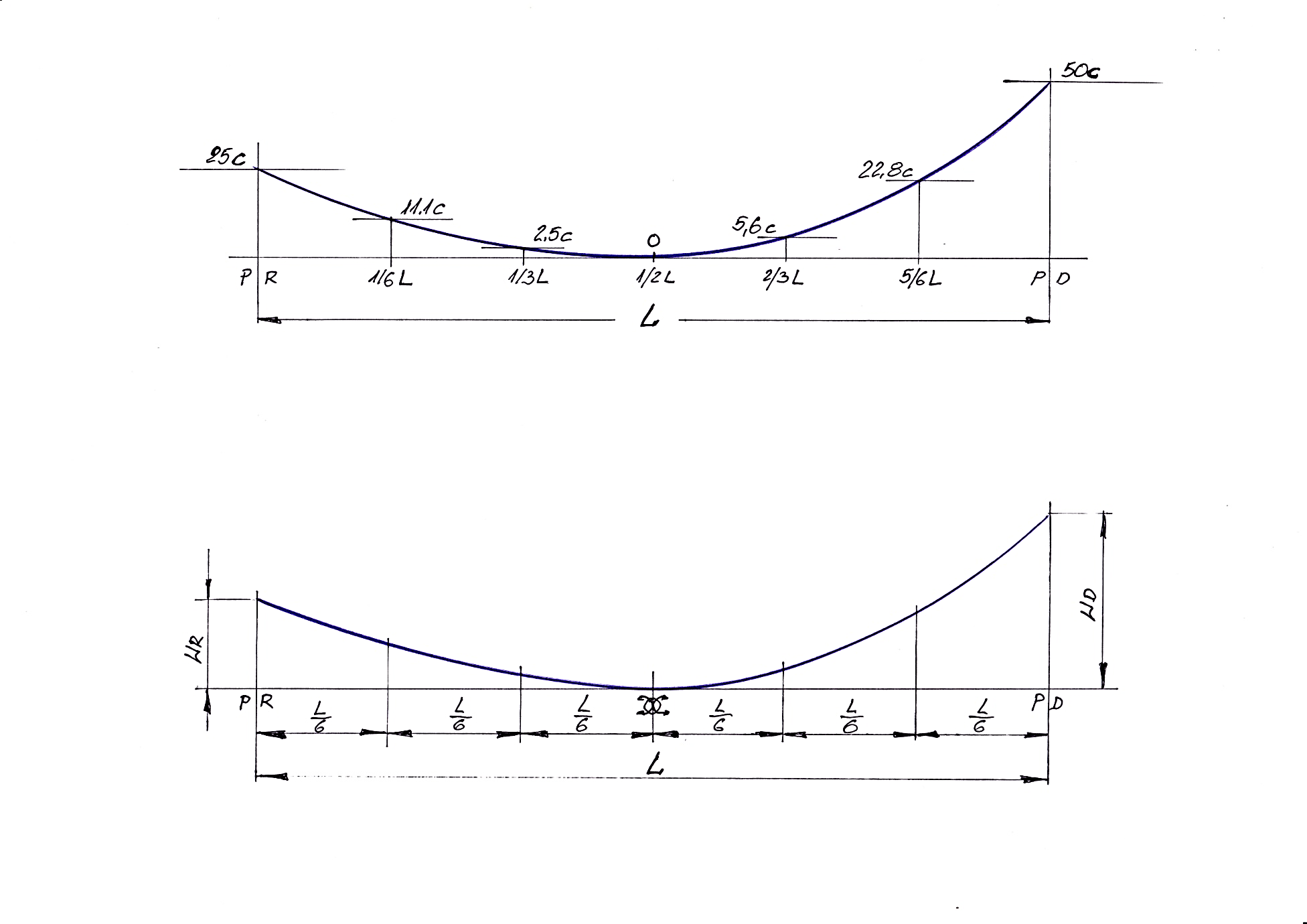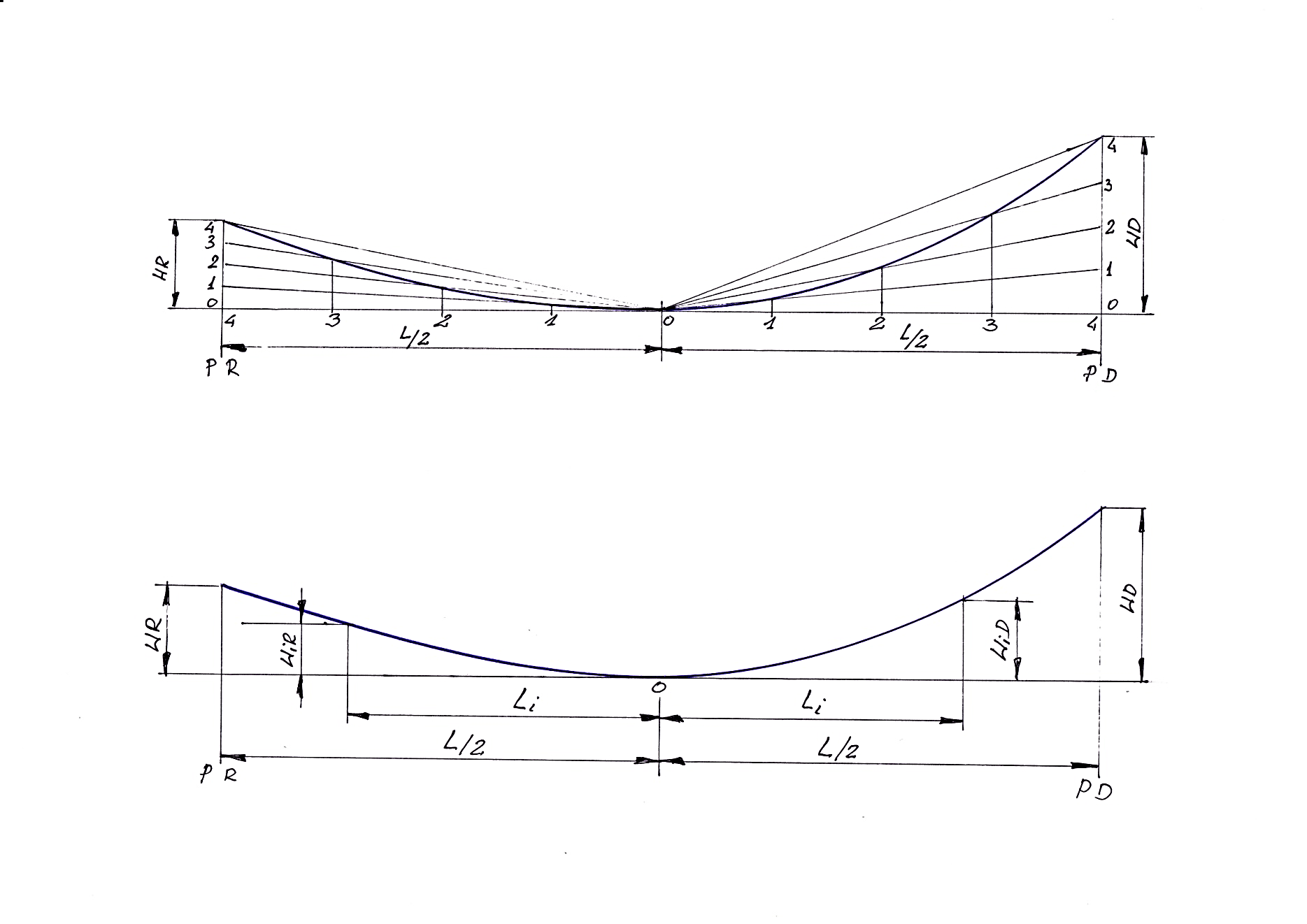 4. Punkty pośrednie wykonujemy wg poniższego schematu : dzielimy połowę długości L oraz WD i WR na jednakową ilość odcinków. Punkt 0 ( w połowie L) łączymy z punktami podziału WD i WR. Z punktów na odcinku L/2 wystawiamy prostopadłe. Przecięcia tych dwóch linii wyznaczają nam punktu krzywej wzniosu – rys.3.