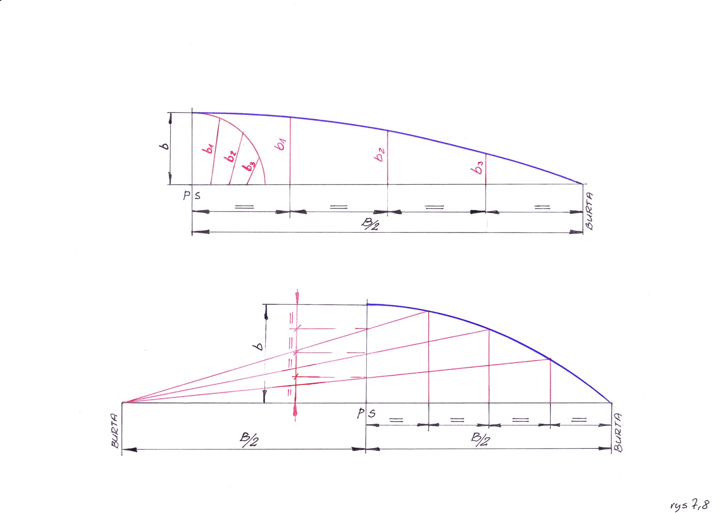 Sposób 1 pokazuje rysunek 8. Wysokość wypukłości w płaszczyźnie symetrii PS przyjmujemy jako b = B/50 , tym promieniem zataczamy okrąg. Podstawę ćwierć okręgu i jego obwód dzielimy na równą ilość części np. 4 ( jak na rysunku) czy 5 w zależności jaką chcemy uzyskać dokładność w rysowaniu krzywej. Punkty okręgu podstawy łączymy ze sobą (linie czerwone) .Połowę szerokości pokładu B/2 dzielimy na taką samą ilość części co okrąg i rysujemy z punktów podziału prostopadłe do podstawy o długościach odpowiadająch odcinkom okręgu kolejno b1 , b2 , b3 ,b4 . Teraz łączymy wierzchołki prostych bn i otrzymujemy w ten sposób krzywą wypukłości pokładu