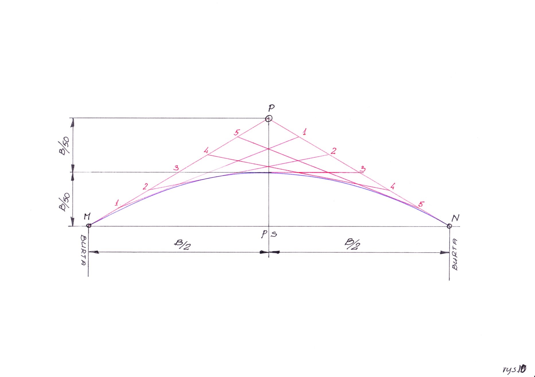 Sposób 3 pokazuje rysunek 10. Metoda ta polega na przedstawieniu linii wypukłości pokładu jako paraboli. Rysujemy odcinek równy szerokości statku B. W PS rysujemy pionowo dwa odcinki równe B/50. Z wierzchołka P prowadzimy proste łączące burty , do punktów M i N. Boki PM i PN tak powstałego trójkąta dzielimy na równe odcinki i punkty oznaczamy na przemian jak na rysunku 10.