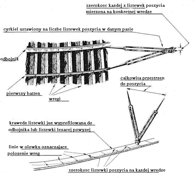 Zakładając że pomiędzy battens musimy zmieścić 6 listewek poszycia ustawiamy cyrkiel redukcyjny na 1:6 i dłuższą parą nóżek cyrkla pobieramy wymiar miedzy sąsiadującymi battenami . Druga para nóżek cyrkla pokaże nam szerokość jednej listewki na tej wrędze - tą szerokość zaznaczamy na listewce delikatnie wbijając w nią igły cyrkla . Takie pomiary musimy wykonać pomiędzy battentami na każdej wrędze i przenieść je w odpowiednie miejsce na listewkę .