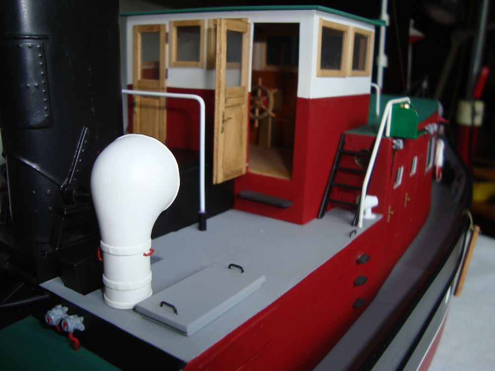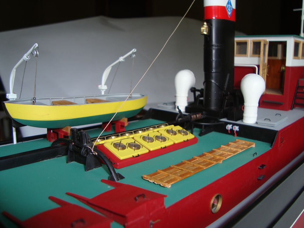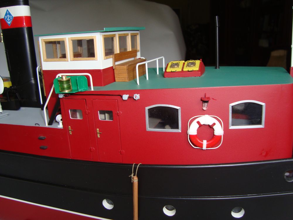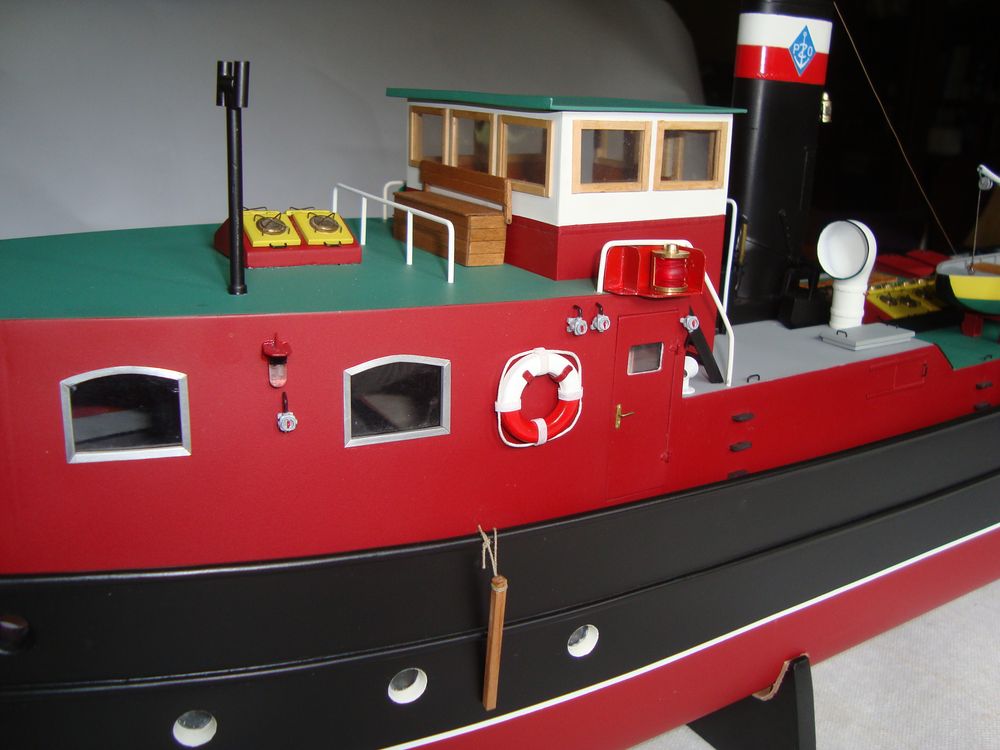 RK w gablocie i przyszedł czas na zakończenie holownika .Sporo czasu zajęło mi mycie modelu bo niezabezpieczony stał na parapecie i muchy go dokumentnie ob.....Wykończenie sprawiło mi sporo przyjemności .Masa różnych drobiazgów nieujętych w dokumentacji .Korzystałem ze starych zdjęć i aktualnych .W czasie ulegał modernizacjom także jest sporo zmian .Wygląda sympatycznie i może ktoś podejmie wyzwanie .Jako pływający nie sprawia frajdy bo nie można poszaleć ale jak się go wyposaży w wytwornicę dymu i moduł dźwiękowy to kto wie .Jeszcze tylko gablotka .Pozdr.R