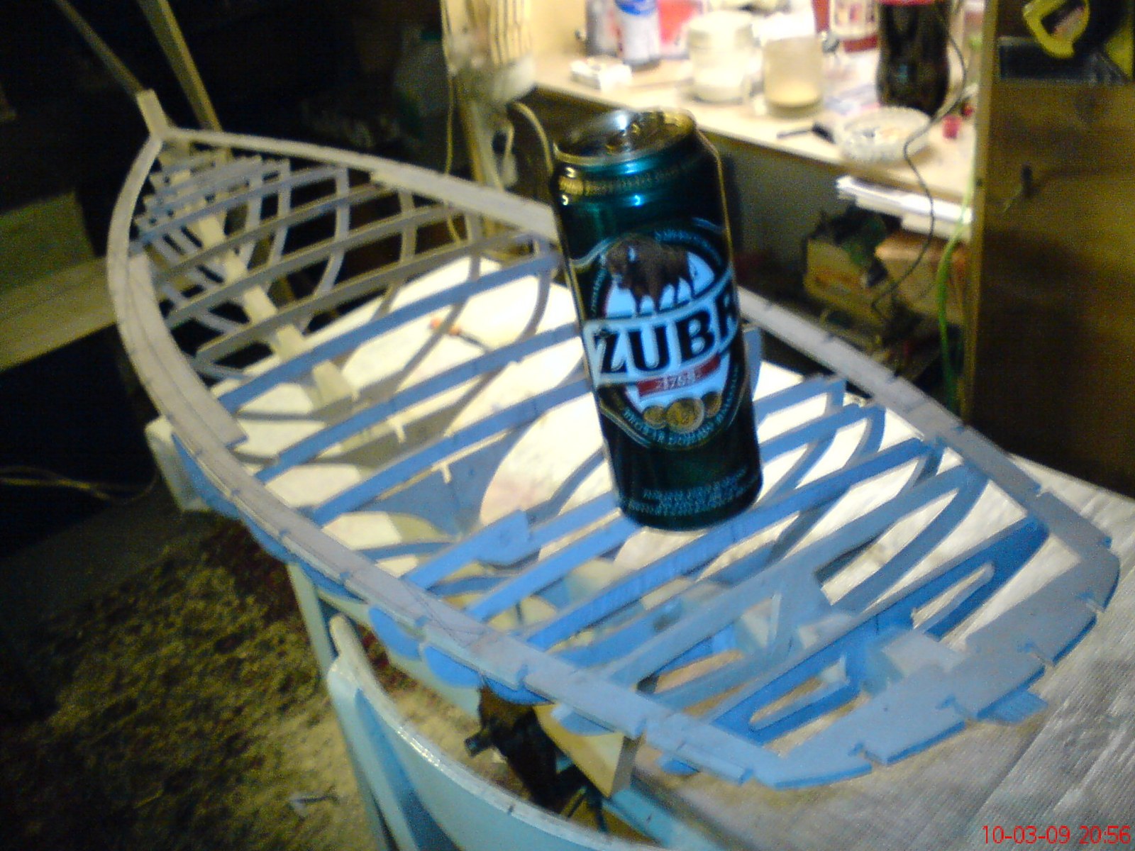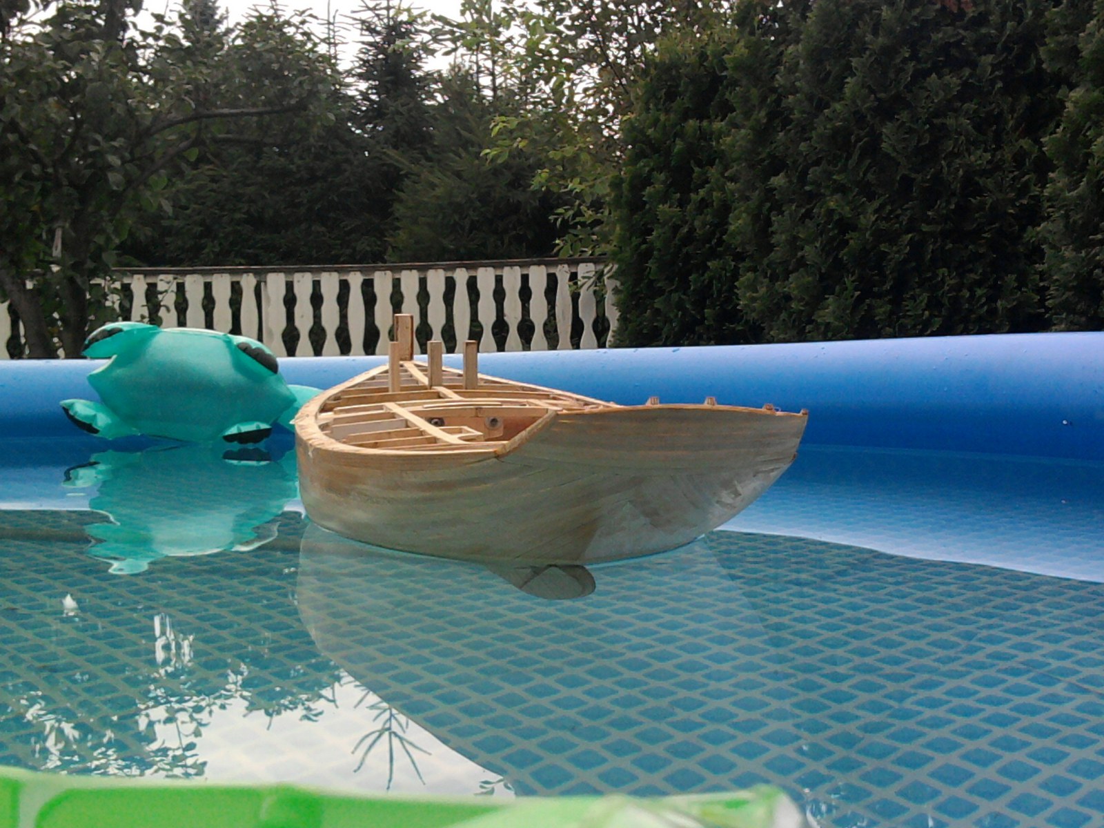 Kolega zrobił model z listew sosnowych ( tzw . słomka ) . Ma to jedną bardzo poważną wade w wypadku modelu pływającego . Drewno pracuje i po jakimś czasie zacznie się wypaczać , pękać . Nawet pokrycie żywicą dwustronnie mało pomaga . Ja już to kiedyś odczułem . Osobiście radził bym obecny model potraktować jak kopyto do zrobienia formy i na niej odbić właściwy model . Ewentualnie potem okleić go fornirem .