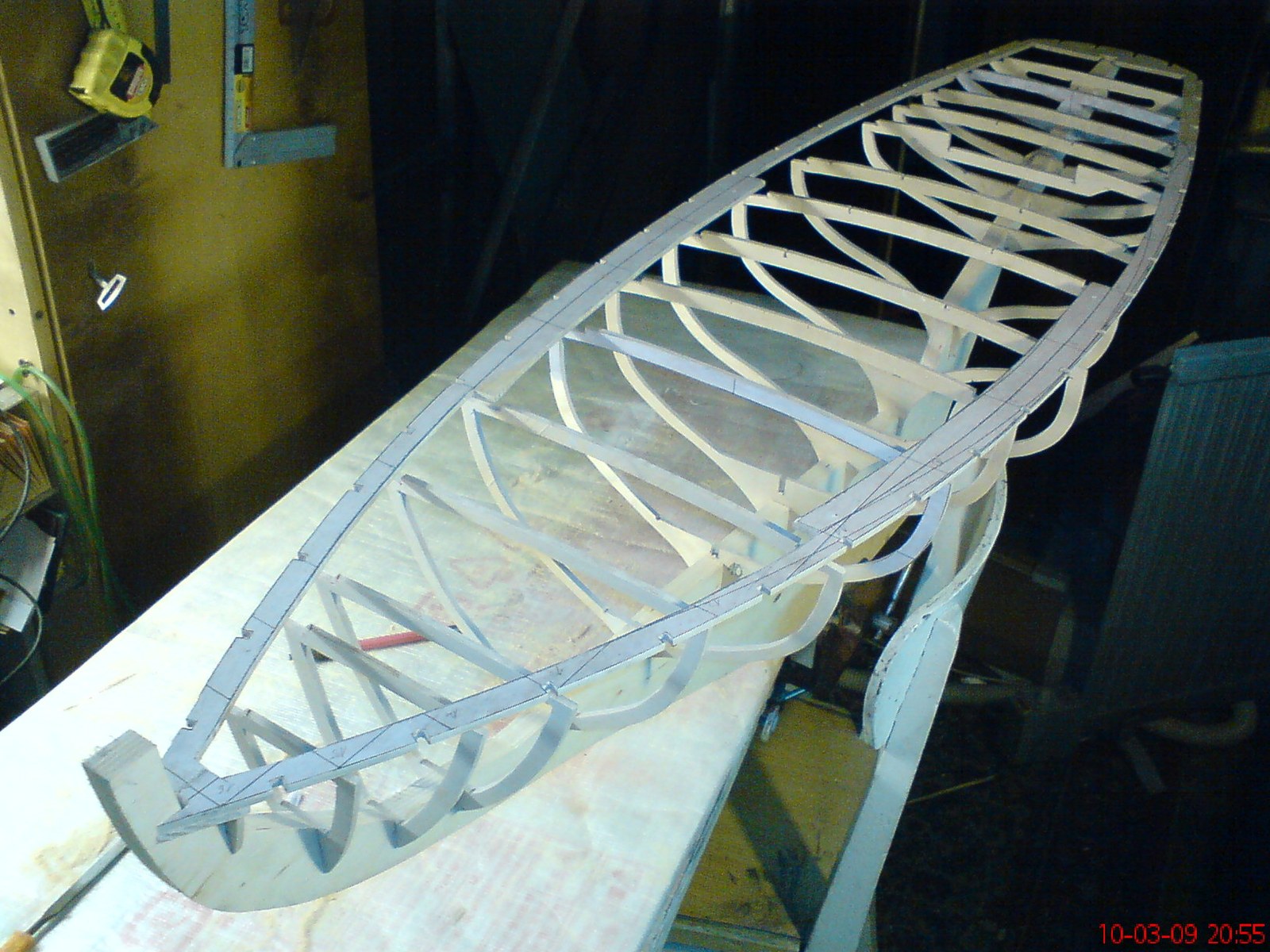 Kolega zrobił model z listew sosnowych ( tzw . słomka ) . Ma to jedną bardzo poważną wade w wypadku modelu pływającego . Drewno pracuje i po jakimś czasie zacznie się wypaczać , pękać . Nawet pokrycie żywicą dwustronnie mało pomaga . Ja już to kiedyś odczułem . Osobiście radził bym obecny model potraktować jak kopyto do zrobienia formy i na niej odbić właściwy model . Ewentualnie potem okleić go fornirem .