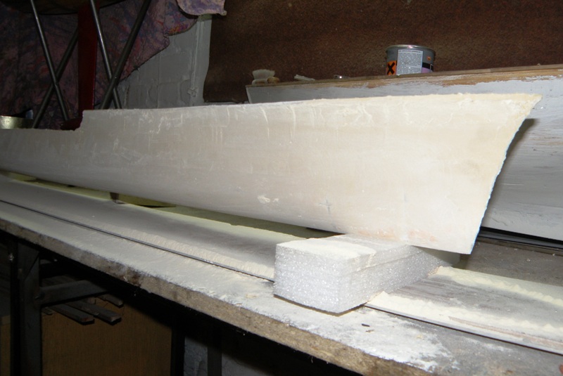 Kadłub posłuży jako kopyto do wykonania formy. Wykonałem go tradycyjnie, wręgi ze sklejki 4mm i podłużnic z listewek 3x3 mm, które ułatwiają późniejsze szlifowanie pianki. Po weszlifowaniu okleiłem cały kadłub papierem na klej do paneli,fajnie wzmacnia powierzchnię, nie ugina się przy szlifowaniu szpachli. Jutro kładę pierwszą warstwę farby więc zobaczę ile jeszcze czeka mnie szlifu. Szpachli użyłem poliestrowej z nowola.