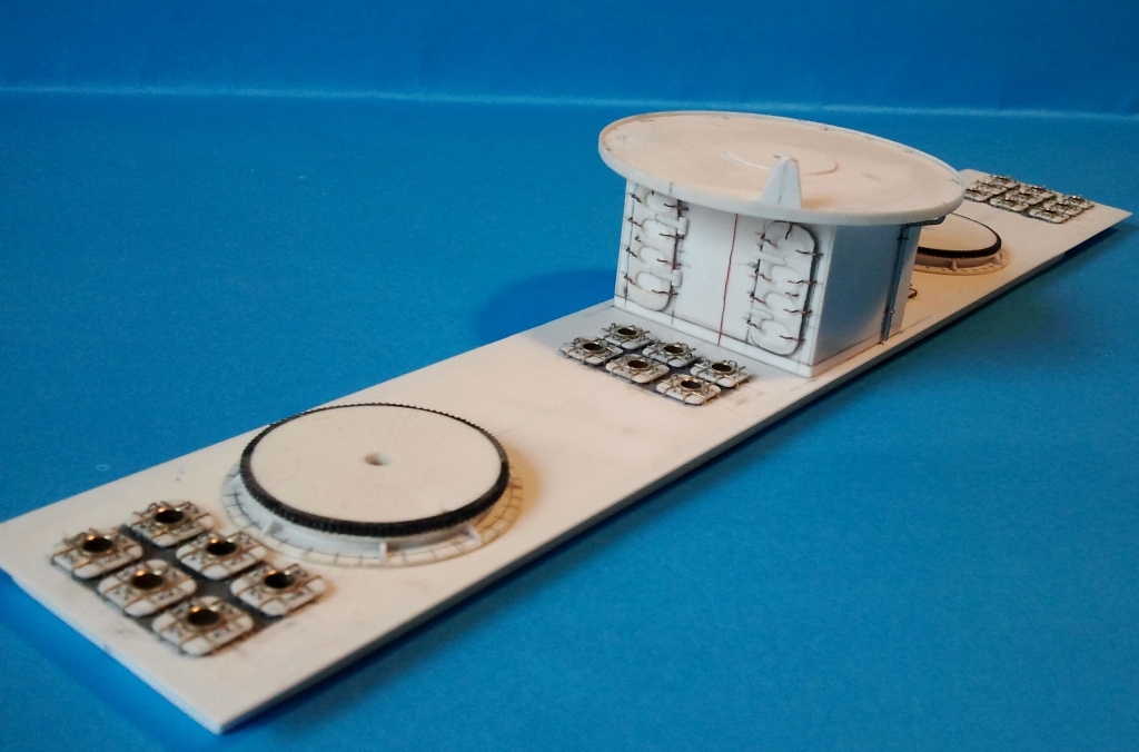 Kolejny większy element na ukończeniu to górna część nadbudówki maszynowni. Pozostało zamontować zaczepy odciągów do wyrzutni w położeniu marszowym no i reling z drabinkami. Przez ostatnie kilka dni męczyłem świetliki, które ze względu na wymiary byłem zmuszony nieco uprościć.