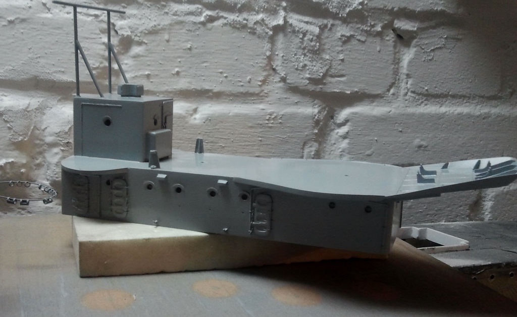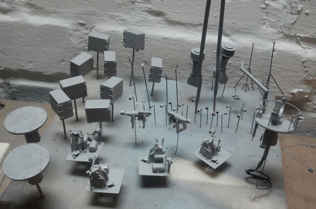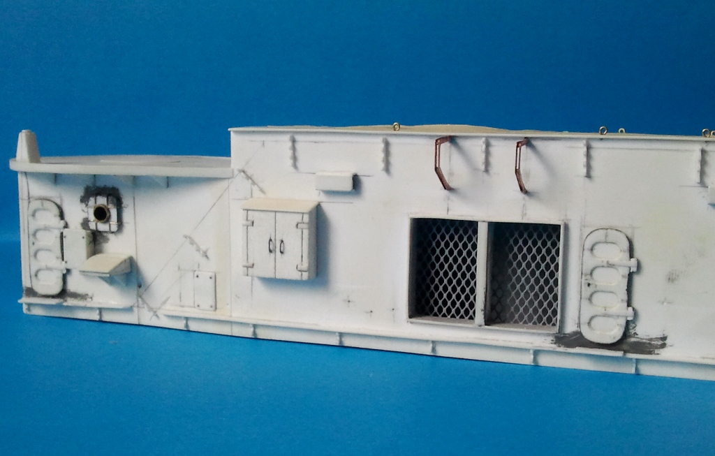 Kolejny większy element na ukończeniu to górna część nadbudówki maszynowni. Pozostało zamontować zaczepy odciągów do wyrzutni w położeniu marszowym no i reling z drabinkami. Przez ostatnie kilka dni męczyłem świetliki, które ze względu na wymiary byłem zmuszony nieco uprościć.