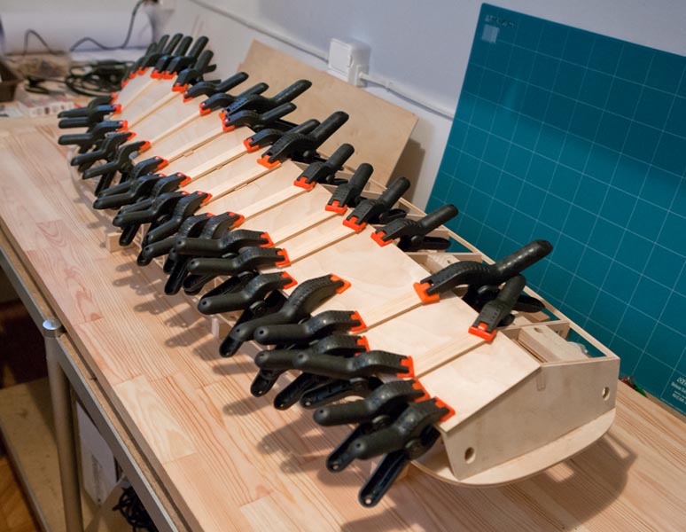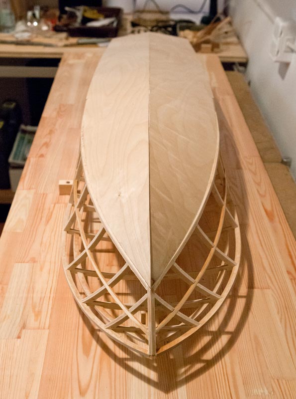 Podczas klejenia poszycia dna szkielet nie był przymocowany - błąd nowicjusza. Ale sprawdzałem i nie zwichrował się.