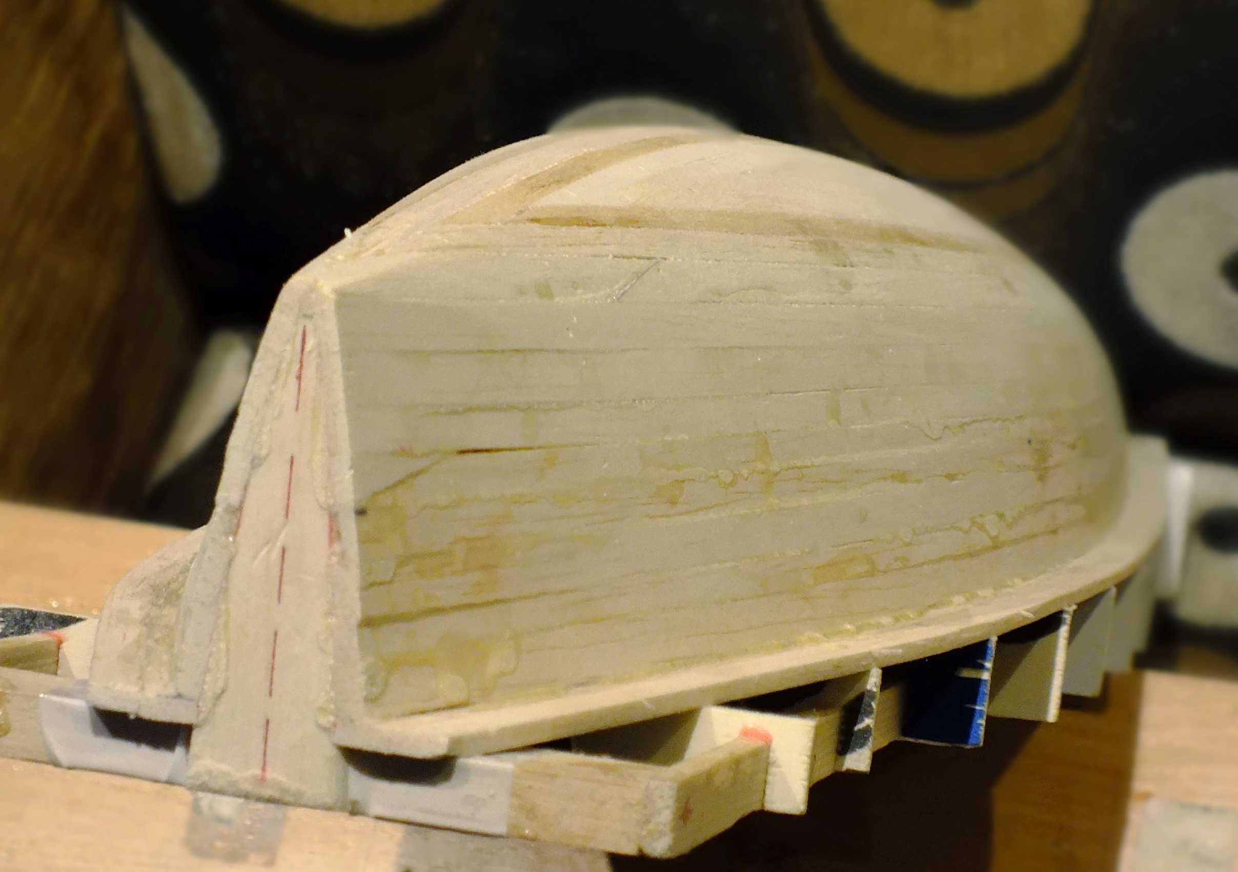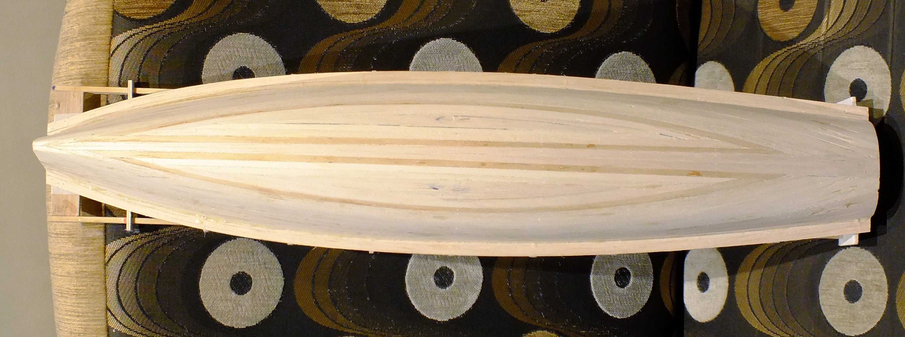 Pierwszy etap budowy kopyta/kadłuba dobiegł końca. Ostatnie dwie klepki dopasowane i wklejone. Po utwardzeniu się spoiny będzie można odstawić na kilka dni kadłub do uleżenia się, lub jak kto woli do wysezonowania. Chodzi o zminimalizowanie naprężeń w kadłubie przed ostatecznym szlifowaniem.