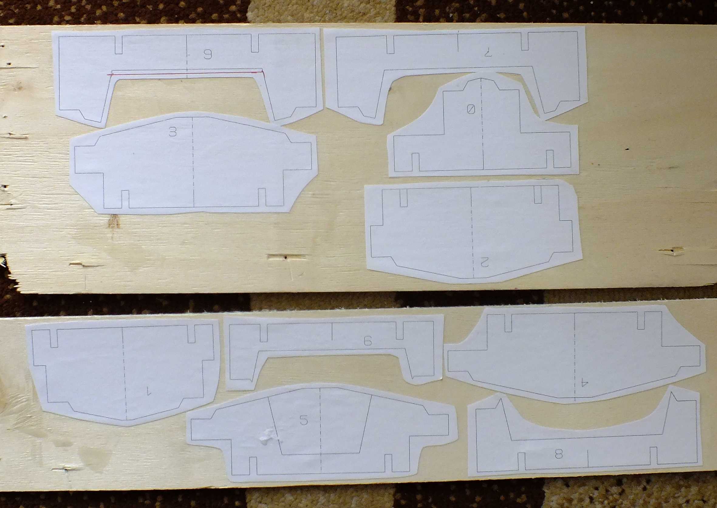 Dziś wyciąłem szablony i może skleję heling do budowy formy pokładu. Na zdjęciach maszyna do wycinania i szablony pokładu ustawione już we właściwej kolejności.