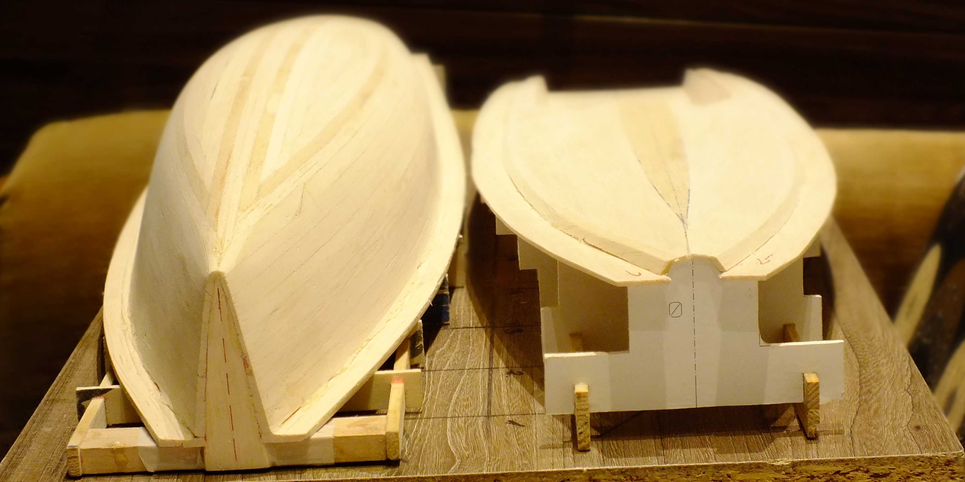 Pierwszy etap budowy kopyt już zakończyłem. Kopyto kadłuba zostanie pokryte cienkim laminatem szklanym (tkanina Aeroglass ~50 g/m^2) i dopiero po tej operacji zostanie wykończone do postaci gotowej do formowania. Po cichu liczę na dodatkowy ładny kadłubek drewniany. Pokład będzie tylko szpachlowany i malowany. Tył pokładu będzie dopasowywany już do formy kadłuba, mniej więcej od miejsca gdzie się kończy kołnierz.