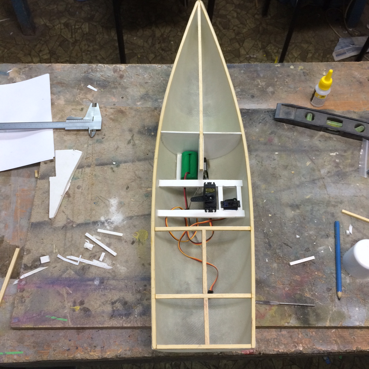 Dziękuję, za rady i zainteresowanie. Odpowiem ogólnie. Wręga, skrzynka mieczowa i konstrukcje pod serwa są z PCV. Wszystko wklejone jest na CA tymczasowo, po rozplanowaniu elementów konstrukcja będzie wzmocniona żywicą. Dzisiaj powstały mocowania pod serwa i pakiet. Tak to wygląda na zdjęciach:)
