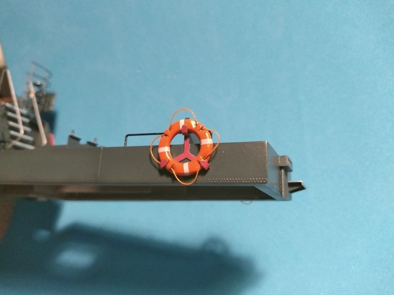 Kuter otrzymał już komplet środków ratunkowych, obok tratew ratunkowych pojawiły się radiopławy i koła ratunkowe. Przy okazji prac nad wzorcem kół ratunkowych okazało się, że skończył mi się silikon formierski :? No ale przypomniałem sobie, że wieki temu zakupiłem coś takiego jak blue stuff :?: Leżało w mojej chemii i czekało chyba właśnie na ten moment :D Teraz po wszystkim przyznaję, że do odbijania niewielkich obiektów na szybko jest rewelacyjny.