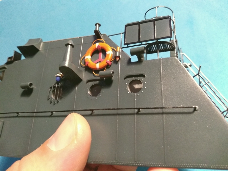 Poniżej linie podziału blach na nadbudówce, wcześniej zrobiłem w podobny sposób na pokładzie: