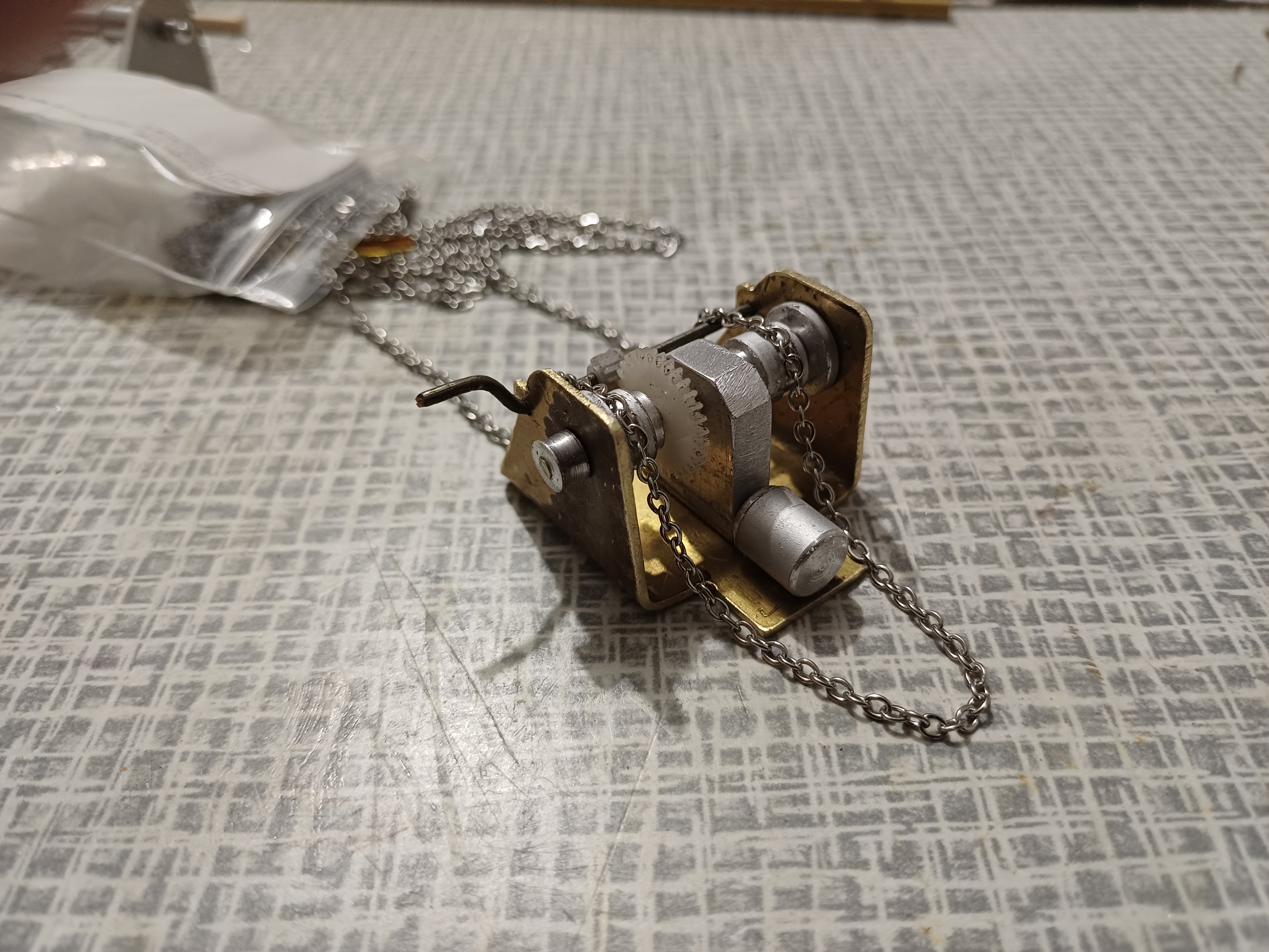 Nie mogę rozgryźć napędu windy kotwicznej. Silnik jest na dole na podstawie ale na widoku z góry wygląda, że wał jest nad osią główną a może to coś innego.