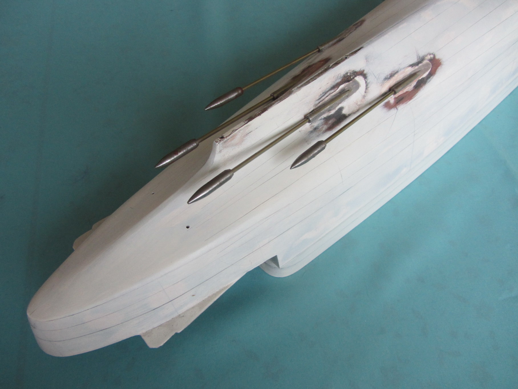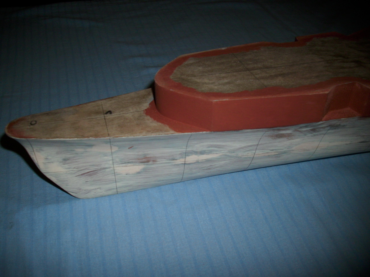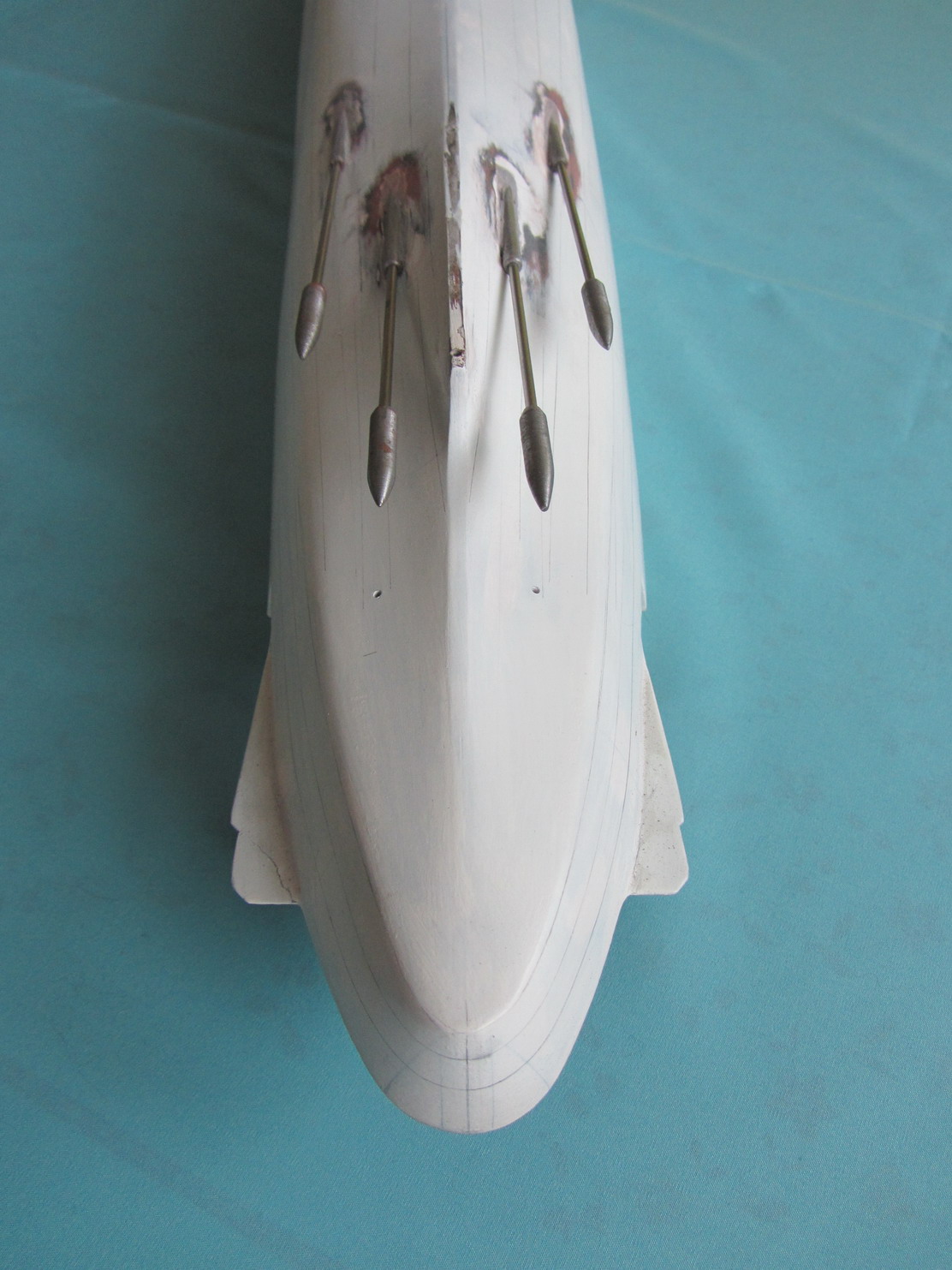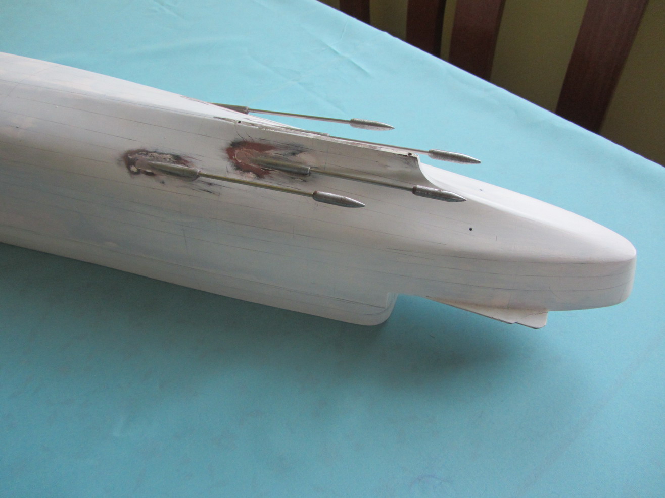 Kadłub z naniesionym markerem. Po szlifowaniu czarno na białym będzie widać każdą nierówność. Na tym etapie juz nie będzie grubszego papieru niż 220.