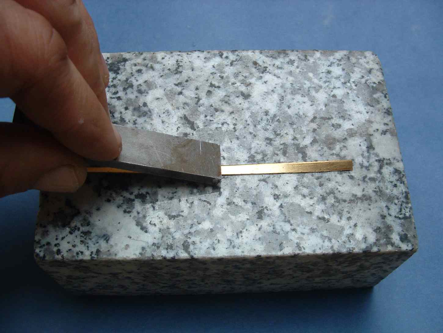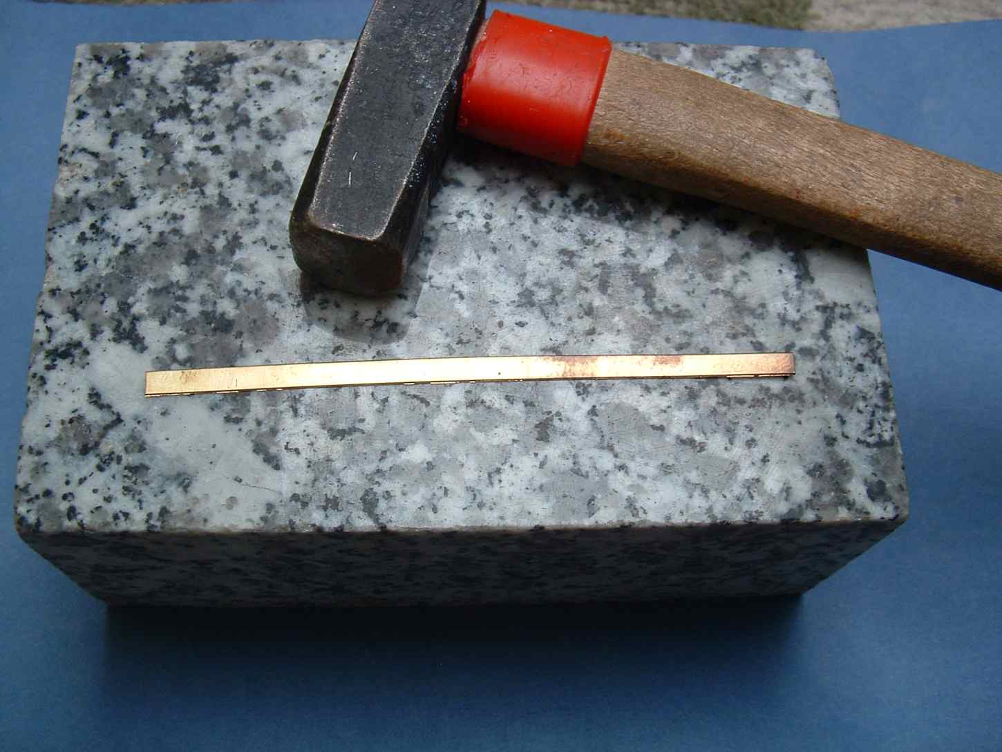 Tak wyprostowany pasek jest prosty w jednej płaszczyźnie ale nadal jest wygięty lekko jak banan dla tego ustawiam do na wspomnianym klocku granitu na sztorc i delikatnie małym młoteczkiem uderzam po krawędzi celem wyprostowania , później jeszcze kilka razy przeciągam już po płaskiej powierzchni wspomnianym kątownikiem lub jakimś innym twardym prostym elementem .