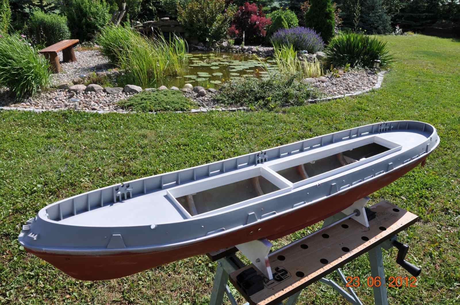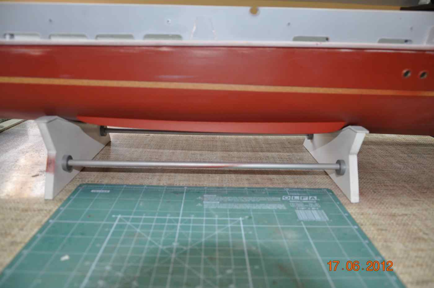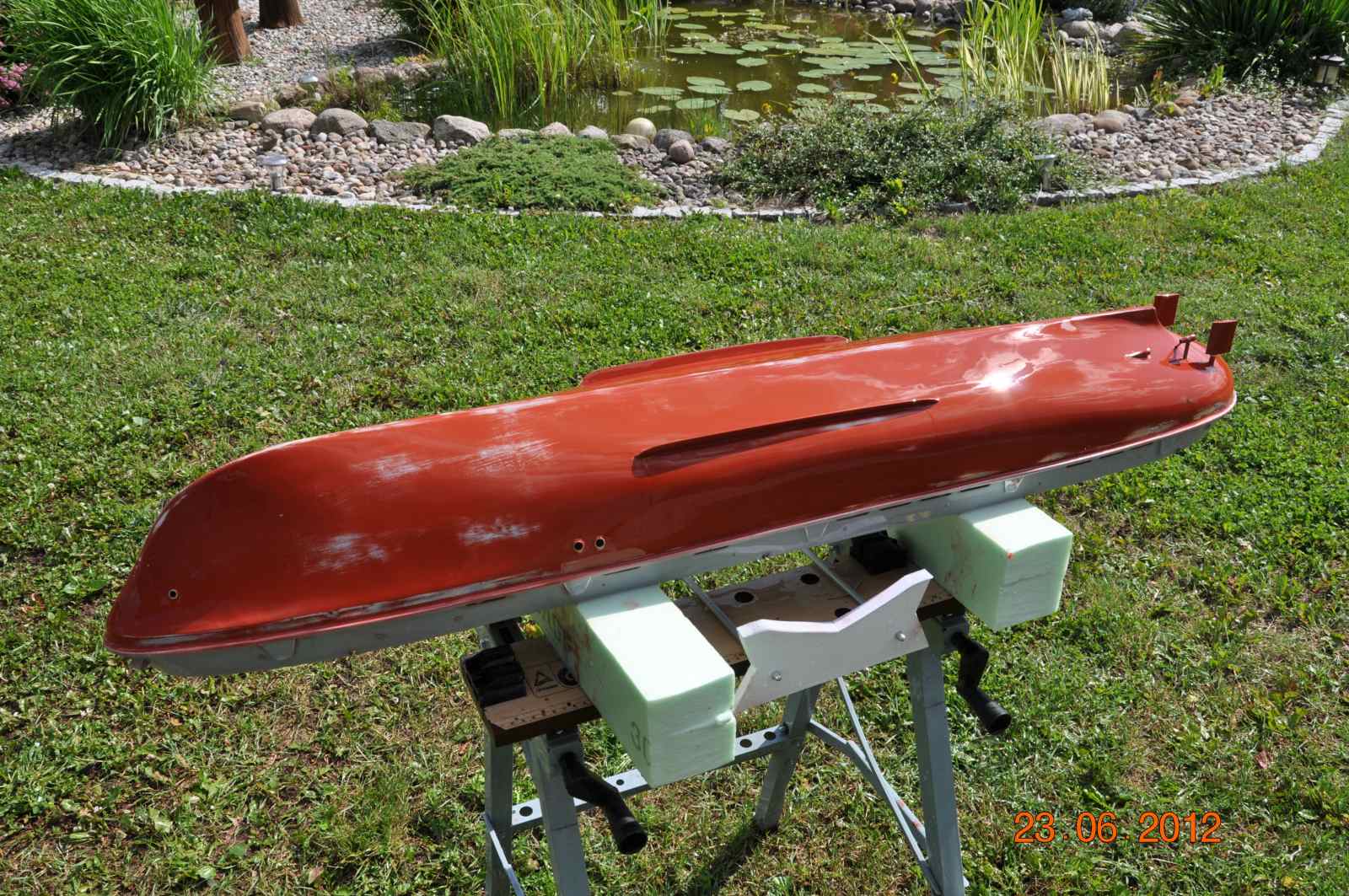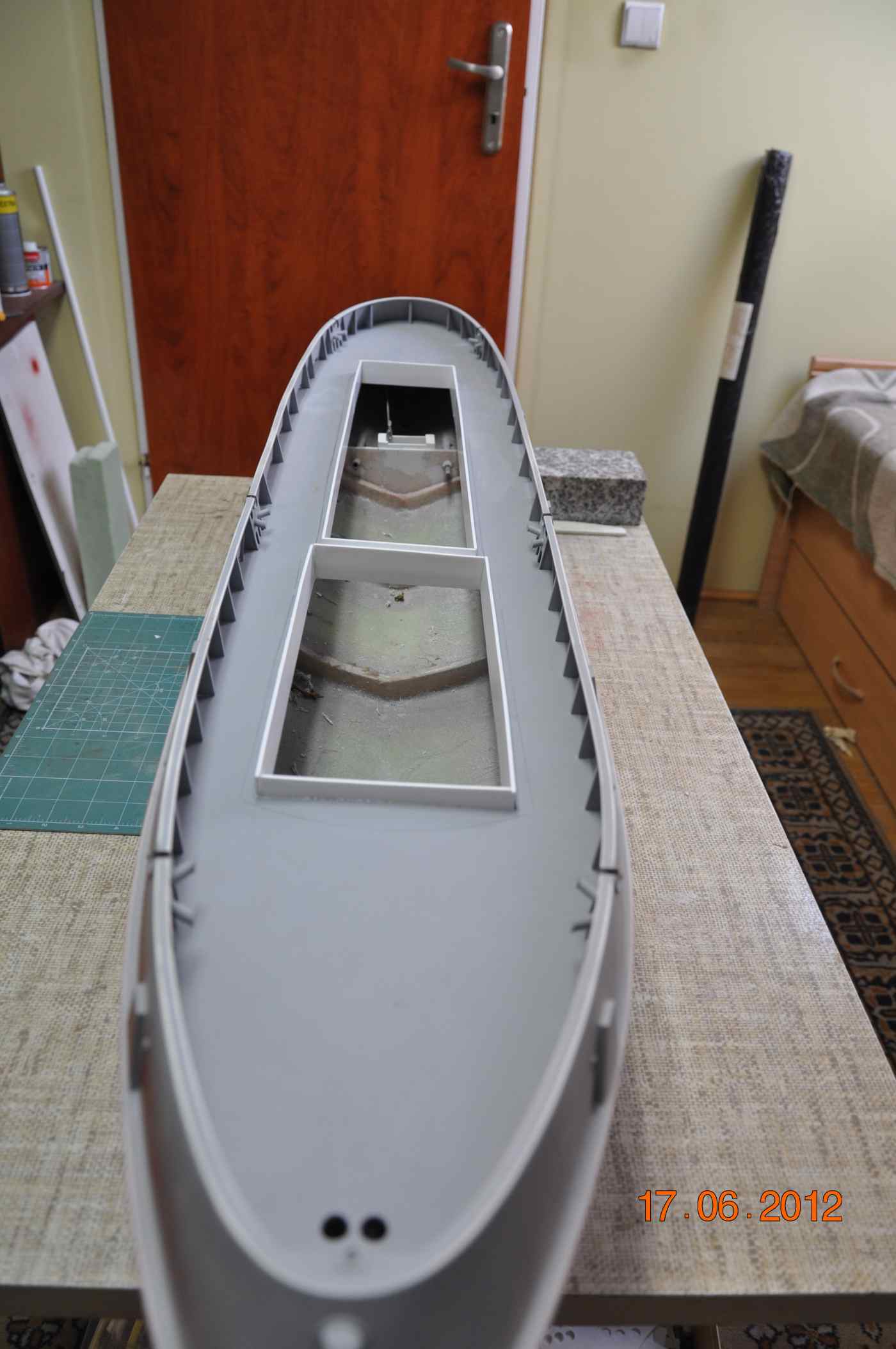 Dziś dopieściłem kadłub już na glanc znalazłem jeszcze kilka rysek które zostały zaszpachlowane i wyszlifowane cały kadłub ,nadburcia i pokład przeszlifowane wodnym papierem 800, jednak w świetle dziennym na dworze widac o wiele lepiej każdą ryskę czy nie doszlifowanie .Kolory jakimi będzie malowany to: podwodna część kadłuba RAL 3011 pół mat , pokład RAL 6010 pół mat, nadburcie wewnętrzne RAL 6027 pół mat , kadłub powyżej lini wodnej oraz nadburcie zewnętrzne czarny pól mat.