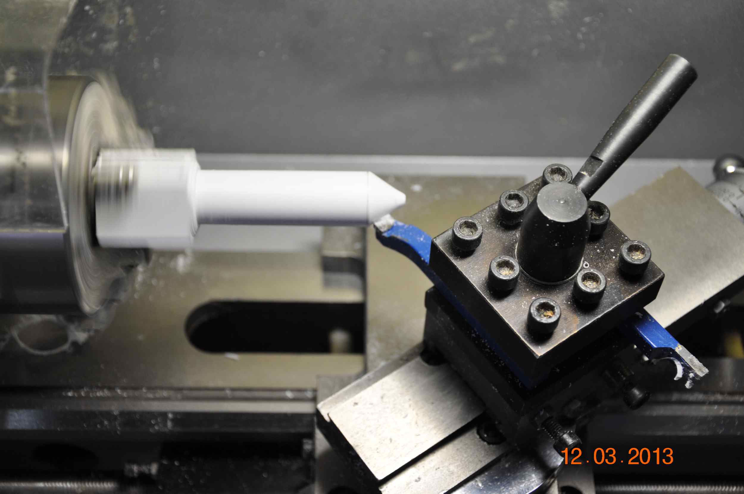 To że polistyren ładnie się obrabia nie muszę nikomu mówić kto kiedy kolwiek korzystał z tego materiału do budowy modelu , tym razem byłem zmuszony sięgnąć po ten materiał także do wytoczenia Boji , mosiądz byłby stanowczo za ciężki jak na taki element , skleiłem klejem CA kilka pasków polistyrenu , podczas toczenia obroty muszą być stosunkowo niskie aby nie tworzył się „spiek” na styku noża , polistyren jak widać doskonale daje się toczyć a powierzchnia jest gładka .