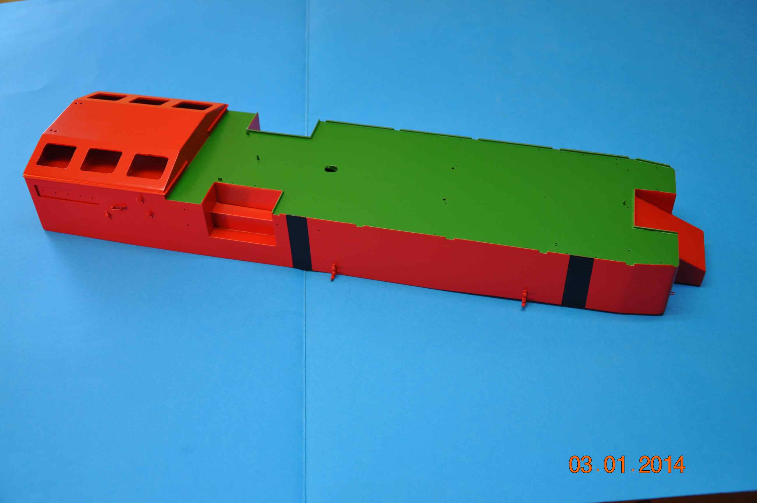 Przyszedł czas na malowanie i montaż elementów rufowa część nadbudówki jest ukończona jak i większość elementów na niej teraz po pomalowaniu zamontowane zostaną wszystkie duperele tak aby już do tego elementu nie wracać , dziś zdjąłem maskowanie i tak to wygląda .