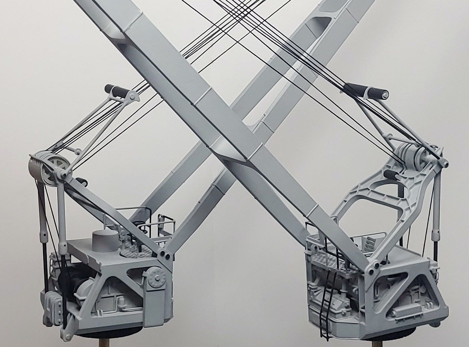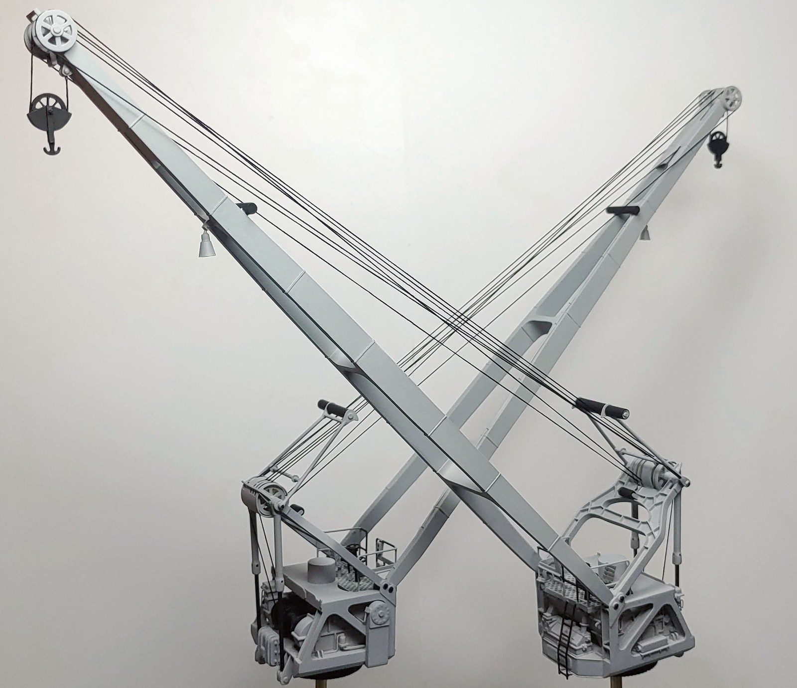 5 tygodni pracy i dźwigi skończone. Każdy z dźwigów to 504 pojedyncze części łącznie z linami. Podstawa w najszerszym miejscu to 35mm, ramię dźwigu 210mm.