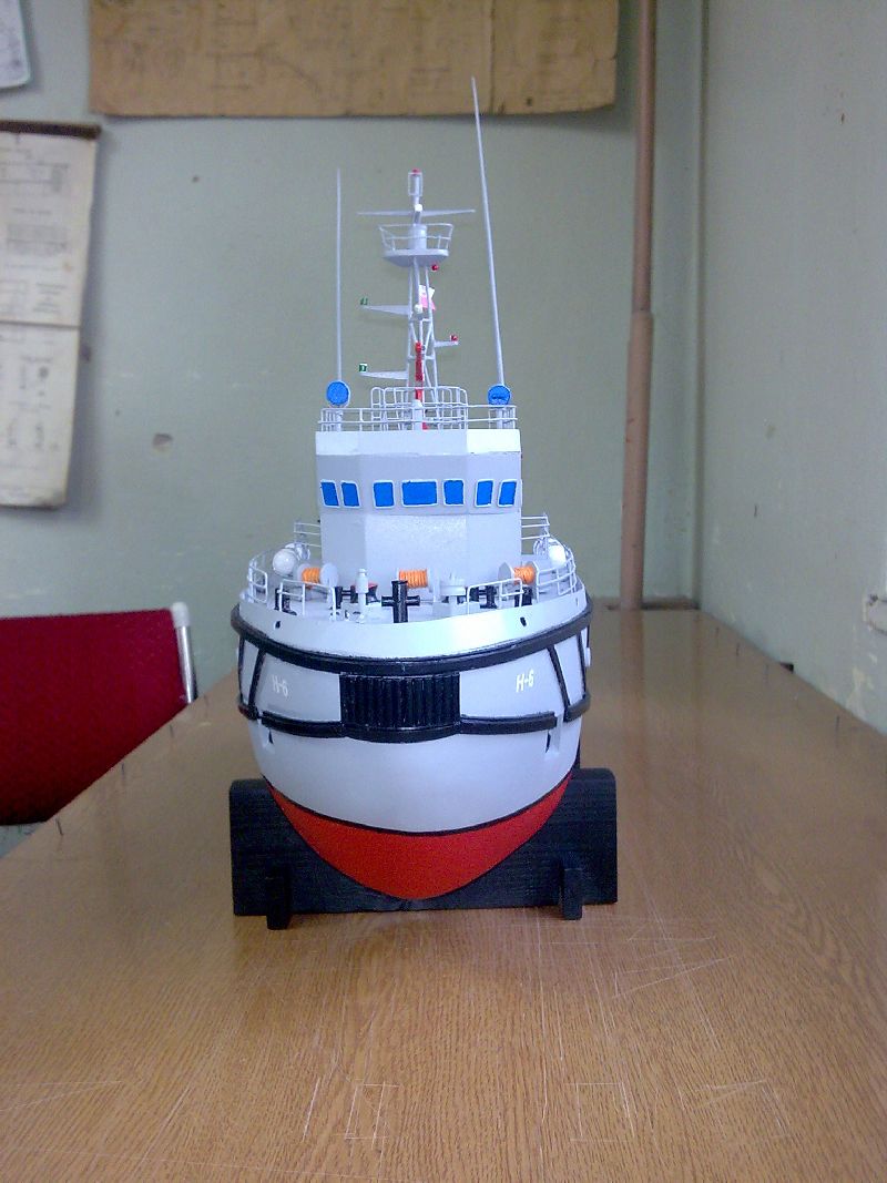 Sam kadłub wykonany był z czterech sklejonych ze sobą sosnowych belek o przekroju 100mmx100mm. Później w ruch poszło dłuto, szlifierki, ścieraki i inne drapiąco-dłubiące sprzęty. Całość pokryta mieszaniną talku i kleju. Zresztą metoda jak przy Pułaskim. Podstawka dosyć solidna bo łajba ważyła z 8 kg. Na widoku od przodu jest krzywa antena i nie jest to błędem bo na prawdziwej jednostce jest taka krzywa (przyszedł raz pan komandor, powiedział że jest krzywa antena, chciał wyprostować i urwał...
