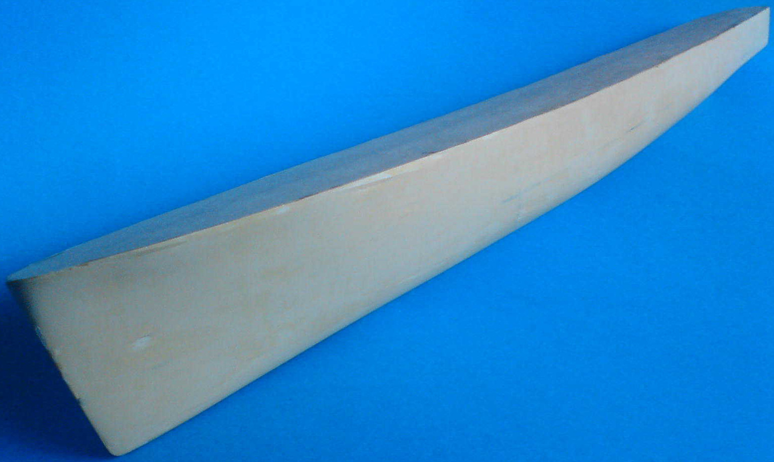 Przygotowany szkielet wypełniłem pianką, którą po wyschnięciu ściąłem i wyszlifowałem do szkieletu uryskując całkiem ładny kształt kadłuba.