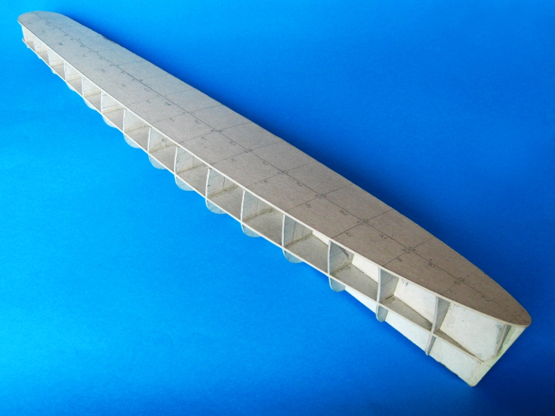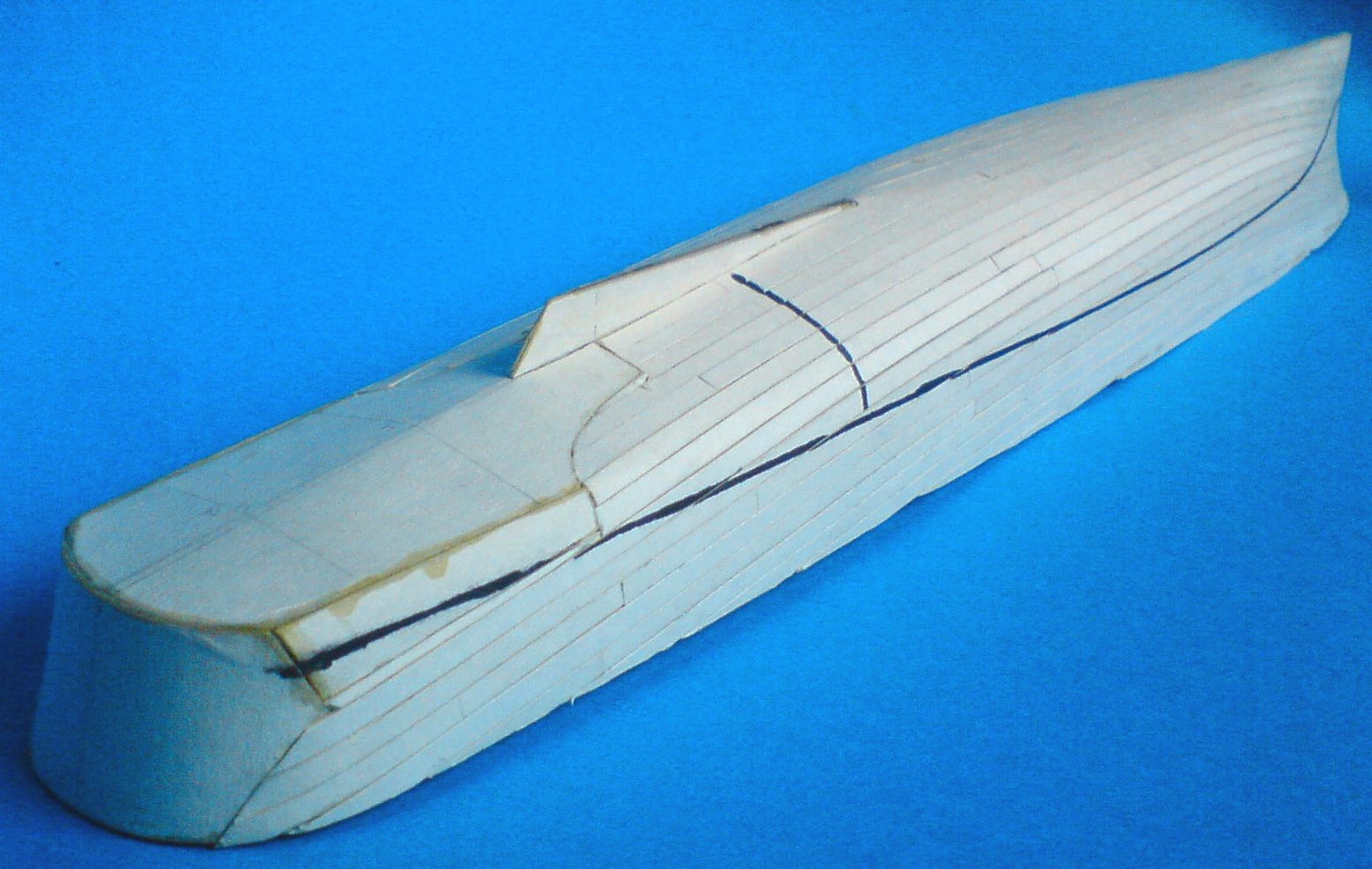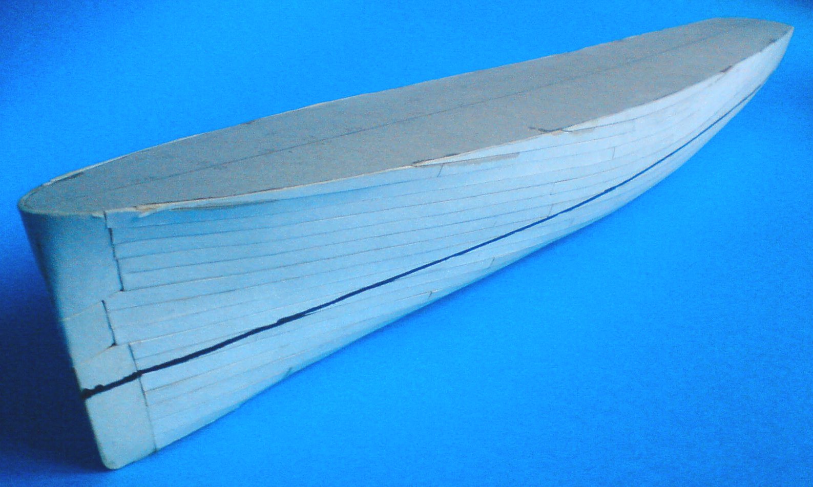 We wcześniejszym opisie pokazałem przygotowany do pokrycia i wypełnienia pianką szkielet. Ponadto wykonałem część poszycia na rufie gdzie powierzchnie burt i dna łączą się ze sobą w formie "kantów". Cały szkielet rozrysowałem o 1 mm węższy niż powinien być po przeskalowaniu z każdej strony oprócz pokładu, dzięki czemu pełny kształt kadłuba był bardzo łatwy do uzyskania chociażby przez naklejenie poszycia zrobionego z tekturki o grubości 1mm.