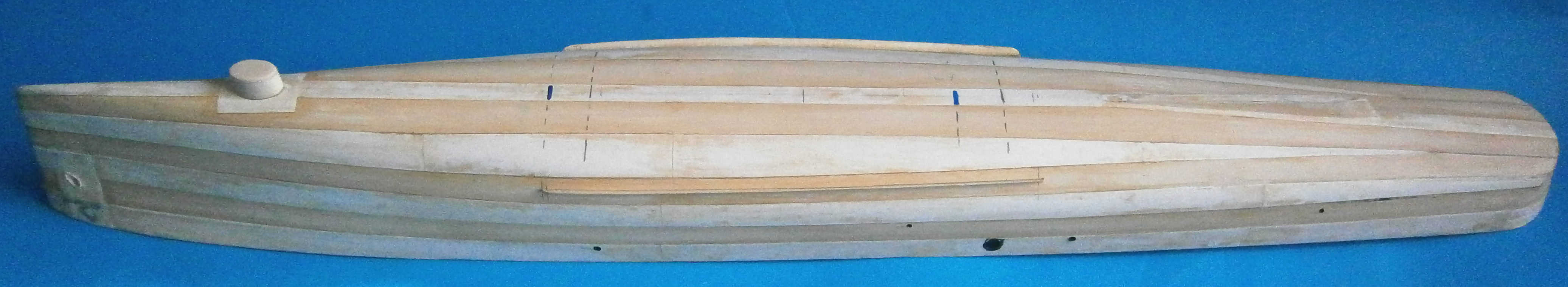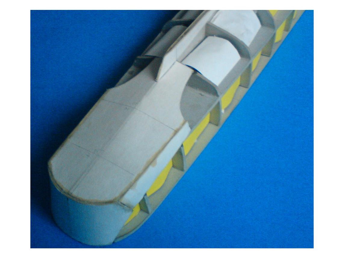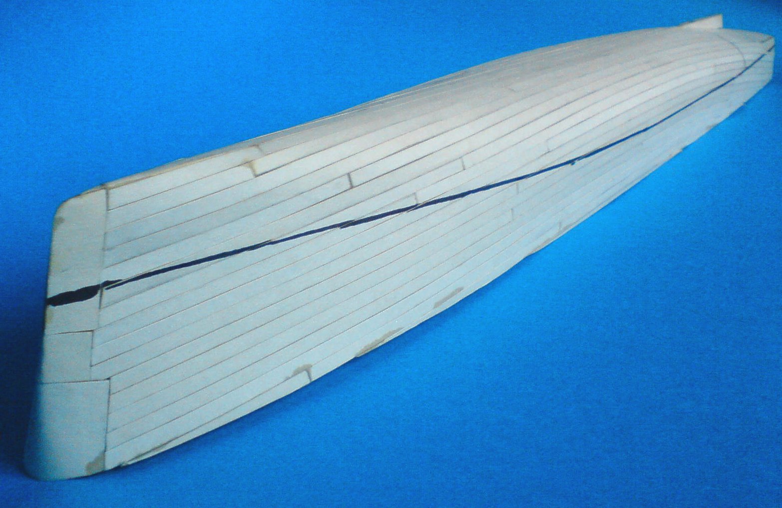 We wcześniejszym opisie pokazałem przygotowany do pokrycia i wypełnienia pianką szkielet. Ponadto wykonałem część poszycia na rufie gdzie powierzchnie burt i dna łączą się ze sobą w formie "kantów". Cały szkielet rozrysowałem o 1 mm węższy niż powinien być po przeskalowaniu z każdej strony oprócz pokładu, dzięki czemu pełny kształt kadłuba był bardzo łatwy do uzyskania chociażby przez naklejenie poszycia zrobionego z tekturki o grubości 1mm.