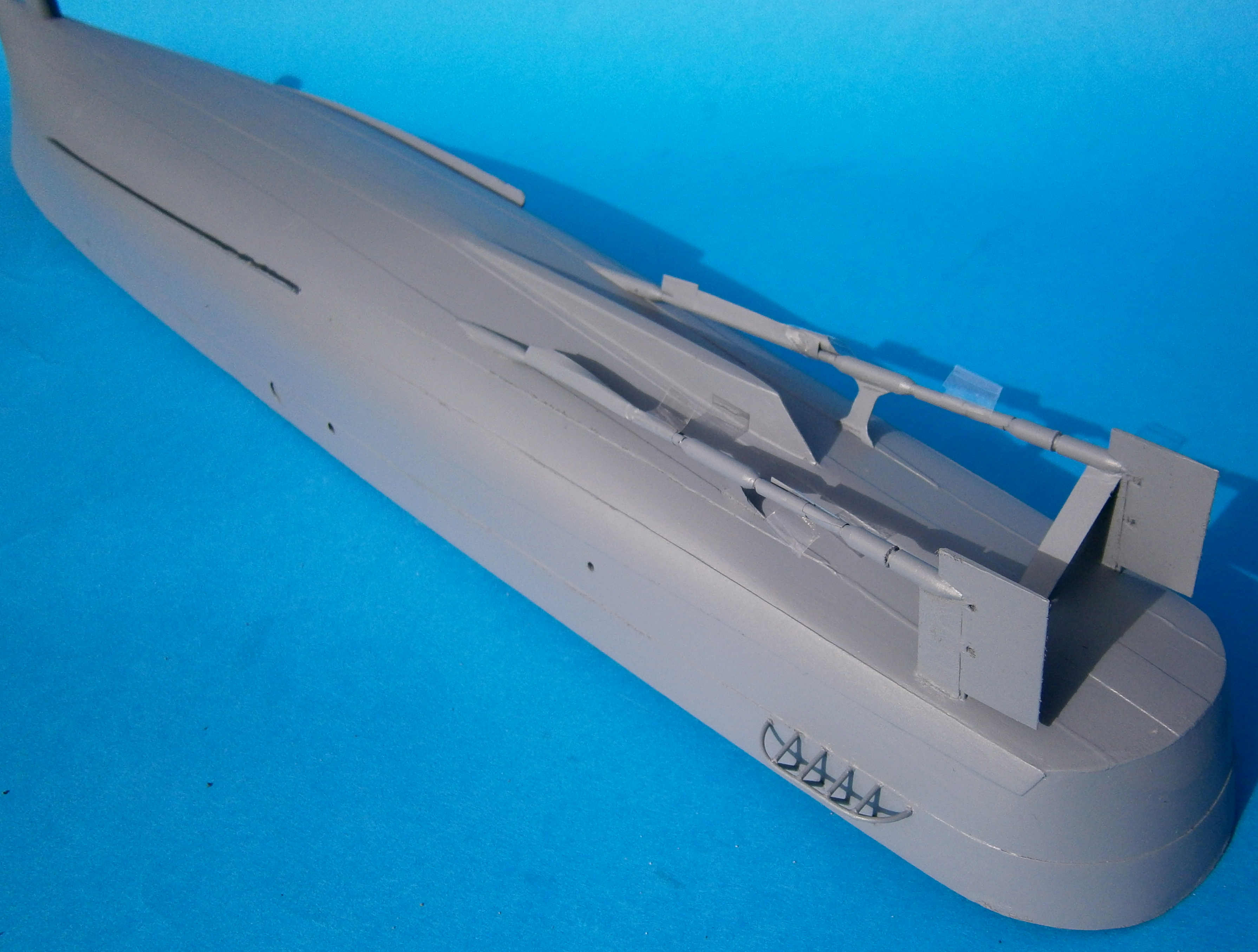Od ostatniego wpisu dorobiłem wały śrub, do czego posłużyła mi szprycha rowerowa, której średnica tylko o 0,05 mm odbiegała od tego co było mi potrzebne. Wypolerowałem ją dzięki czemu wygląda naturalnie i nie muszę malować wałów. Wsporniki wałów powstały z patyków od lizaka (o idealnej średnicy) i kilku kawałków polistyrenowego pudełeczka po serku topionym. Stery i reszta tych elementów to karton. Ochraniacze śrub zrobiłem z drutu o odpowiedniej grubości. Nie lutował a kleiłem klejem CA, po wyszlifowaniu efekt elegancki, a trzyma się jak trzeba.