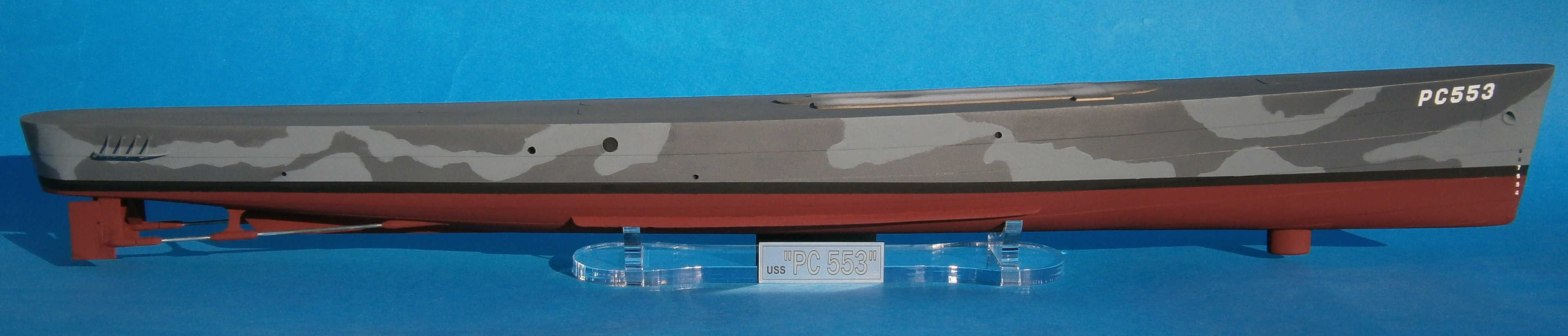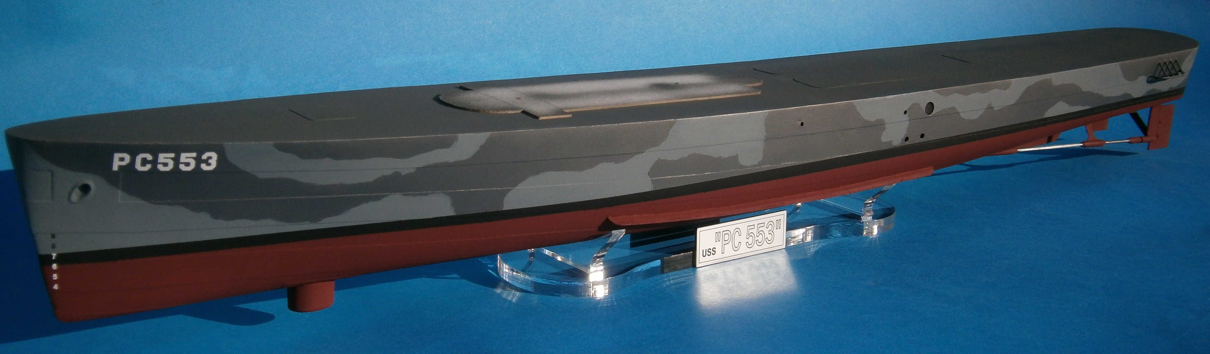 Cały kadłub pomalowałem przy użyciu aerografu. Jako, że oryginalny „PC 553” miał plamy kamuflażu malowane pędzlem musiałem użyć masek całego kadłuba żeby nie wyszły mi miękkie przejścia między jednym kolorem a drugim (jak to bywa przy aerografie). Najpierw pomalowałem dno, potem pas linii wodnej, następnie jaśniejszy szary po całym kadłubie, po tym nakleiłem maski w kształcie jasnych plam kamuflażu i potraktowałem ciemniejszym szarym. Na koniec pokład.