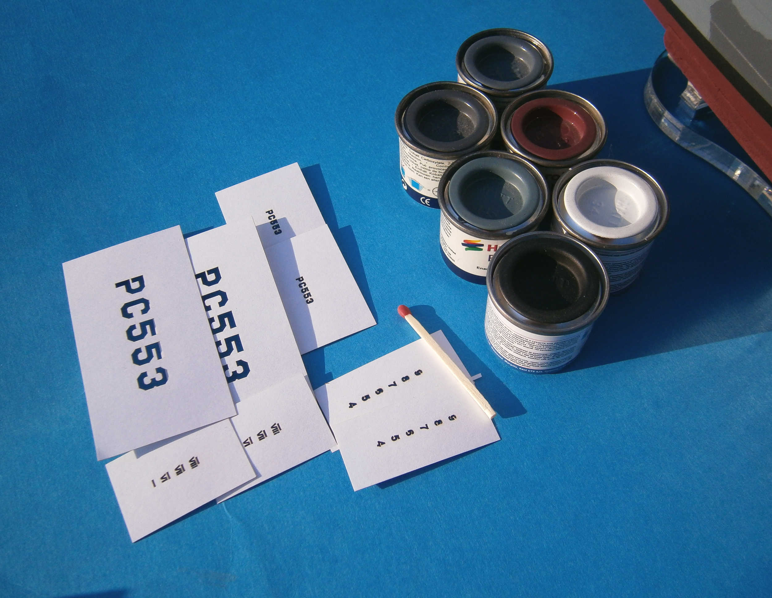 Wszelkie napisy i oznaczenia na kadłubie zrobiłem używając masek, które wyciąłem sobie na laserze w najtańszym papierze samoprzylepnym. Jakość tych masek dorównuje najlepszym kalkomaniom a użycie najtańszego papieru samoprzylepnego gwarantowało, że klej na nim będzie do niczego i nie muszę się obawiać, że przy ściąganiu maski po malowaniu zerwę pół farby z modelu. Wyszło fajnie...