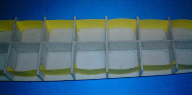 Postanowiłem wykorzystać fakt, iż wręgi w szkielecie poza dwiema na samej rufie są równych odstępach i zamiast tak po prostu wypychać szkielet gazetami wykonałem najpierw "grodzie" (tak mniej więcej 5 - 10 mm od krawędzi wręg), któe znacznie całą tą zabawę uprościły.