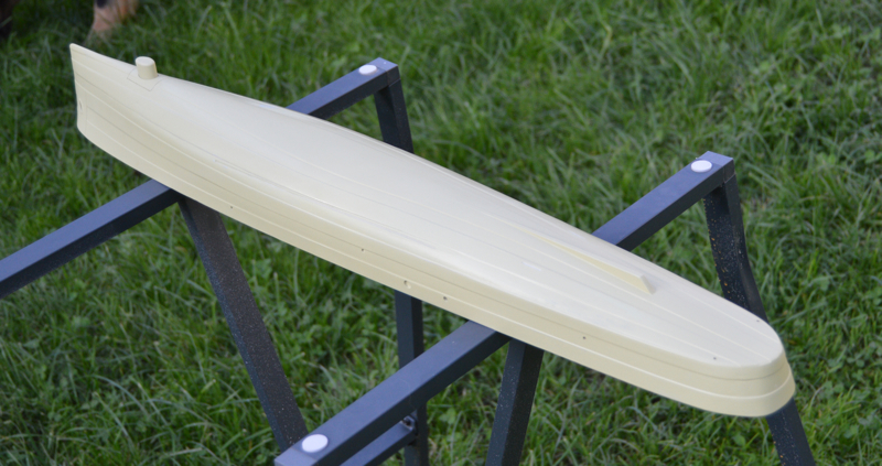 Niestety muszę zauważyć, iż kadłub na zdjęciach - choć ładny - ma trochę "nieścisłości" jeśli chodzi o układ i szerokość pasów blachy. Zdaje się, że w części dziobowej tych jednostek miały one jednakową szerokość, rufa też nieco inaczej powinna się prezentować. Niezbyt odpowiada to planom i zdjęciom jakie znalazłem szukając materiałów do modelu...