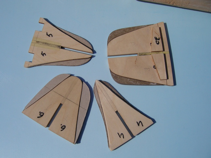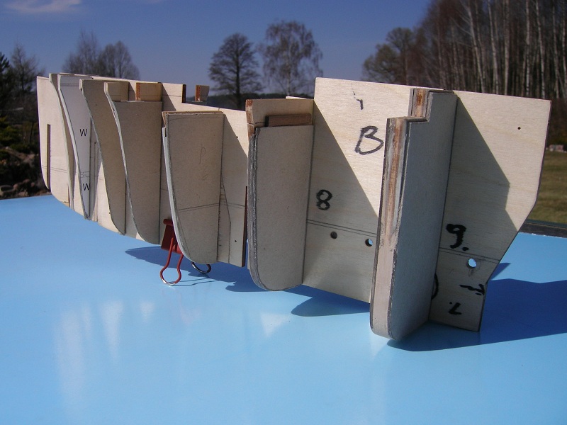 Sklejenia kadłuba -wklejania wręg nie będę opisywał z wiadomych względów. Porównanie wycinanki i „składanki” : Część środkowa kadłuba pokrywa się ze sobą. Część rufowa-niewielkie różnice w szerokości 2 wręg. Część dziobowa – dwa światy. Dorobiłem właściwe obrysy wręg , dosztukowałem z kartonu 2 mm, zmieniłem umiejscowienie wręg na stępce (cały czas za wzornik służyły szablony z wycinanki).