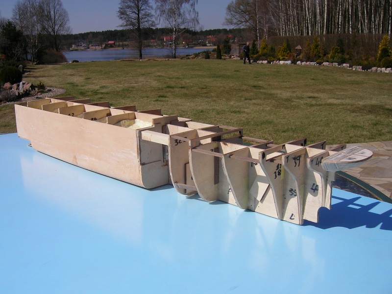 A więc od początku. Dotychczas budowany kadłub znalazł swoje miejsce. Był niezliczoną ilość razy przerabiany a i tak był do d…. . Po przeanalizowaniu wielu relacji dotarło do mnie, że nieodwracalnych błędów popełnionych na początku prac, po prostu nie da się naprawić. A więc oryginał 100 lat temu pochłonęła woda, nieudaną kopię