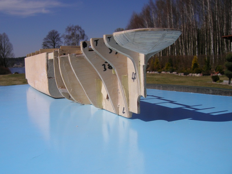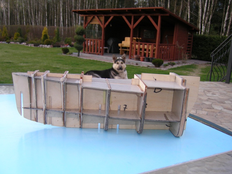 Witam. cd.Konstrukcja dziobu stabilna, ale będzie piankowana , podobnie jak część rufowa - głównie w celach szkoleniowo-ćwiczebnych. Wstępne zaznajomienie się z pianką ( ale w odwrotnej kolejności) miało miejsce na części środkowej kadłuba. Najpierw poszycie dna i burt ze sklejki 1mm -wzmocnione od wewnątrz kartonem 2 mm. Po wyschnięciu poszycia- pianka do środka. Jak pianka urosła i miała już „skorupkę" to paluchami ugniotłem ją do środka, wyciskając powietrze. Po „zastygnięciu” powstała twarda skorupa. Co to dało? A mianowicie to, że pomimo iż poszycie jest ze sklejki, dodatkowo wzmocnionej kartonem (miedzy wręgami) to i tak poddawało się uciskowi z zewnątrz. Po wprowadzeniu pianki do środka, „ugnieceniu” -z wyczuciem ( właściwie „wygniecenie” powietrza), powstała bardzo stabilna i sztywna konstrukcja. Zapewne nie potrzebne, bo planuję jeszcze dwa poszycia, ale zawsze jakieś nowe doświadczenie z nieznanym materiałem.
