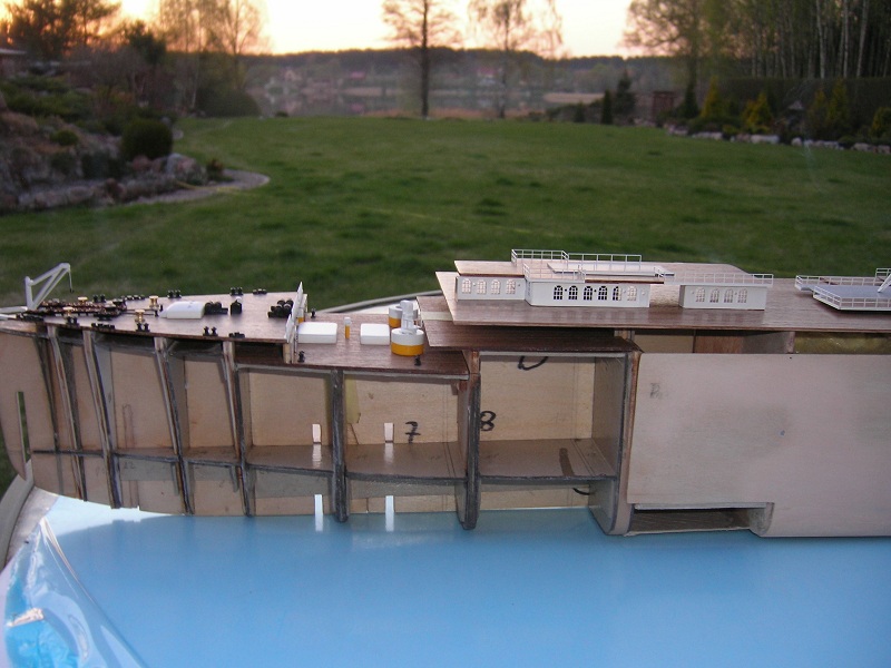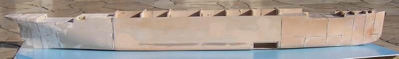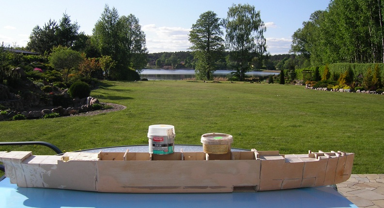 Doszły dodatkowe wzmocnienia kadłuba z kartonu który zabezpieczyłem PATEXEM a brzegi kartonu CA. Oczywiście wszystko nieudolnie małpowane ze skarbnicy materiałów dydaktycznych – przecudowne, fenomenalne, niedoścignione w mistrzostwie etc..etc..etc.-relacje Romka S (przy okazji Wielkie Dzięki).