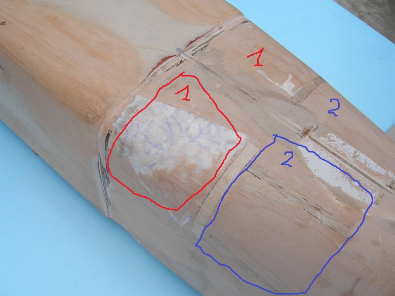Przestrzenie m. nowymi wręgami wypełniłem 3 metodami (cd ćwiczeń) 1-czerwone- Papier toaletowy nasączony wikolem –całkiem twarda skorupa, ale źle się szlifuje, 2-niebieskie- Podłużnie ułożone patyczki – też nasączone wikolem – szlifowanie bez problemu 3. Pianka której trochę zostało w puszce. Wszystko po to, aby warstwa szpachlówki była możliwie najcieńsza.